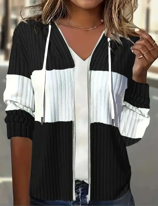 -WOMENS CASUAL WEAR SWEATER. -SIZE- SMALL. -FULL ZIP UP. -FEATURES- HOOD AND DRAW STRINGS. -COLOR- BLACK AND WHITE. -CONDITION-NEW WITH TAGS. NO FLAWS. -GREAT CASUAL WEAR FOR WINTER, SPRING OR FALL! IF YOU HAVE ANY QUESTIONS PLEASE MESSAGE ME. THANK YOU!