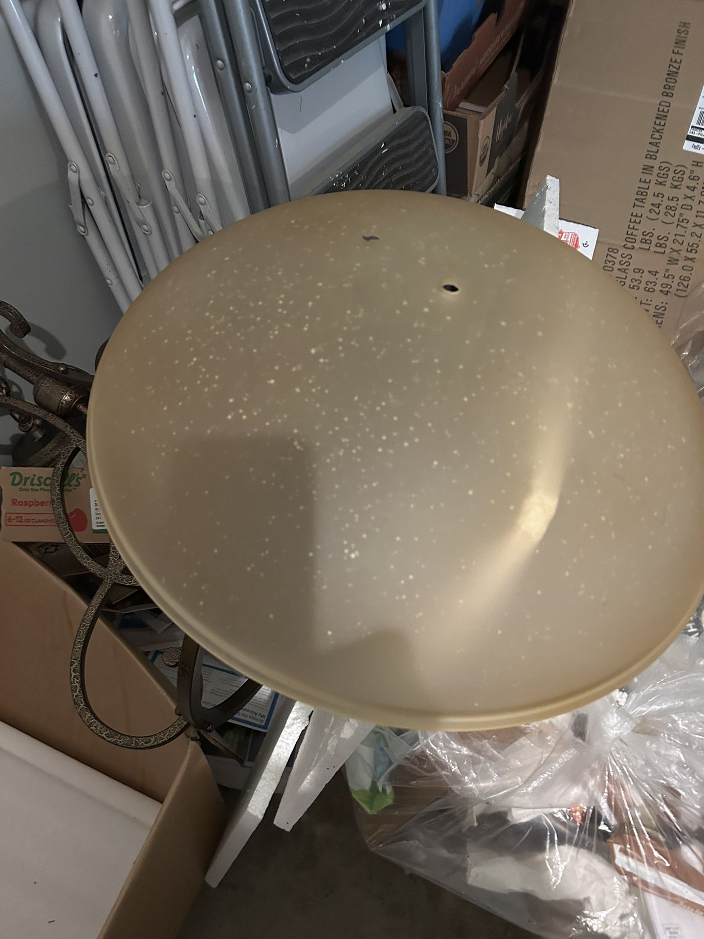 Lighting fixture can be used in dining room, bedroom or wherever. Glass has a light beige color and the hanging fixture is bronze. Looks new.