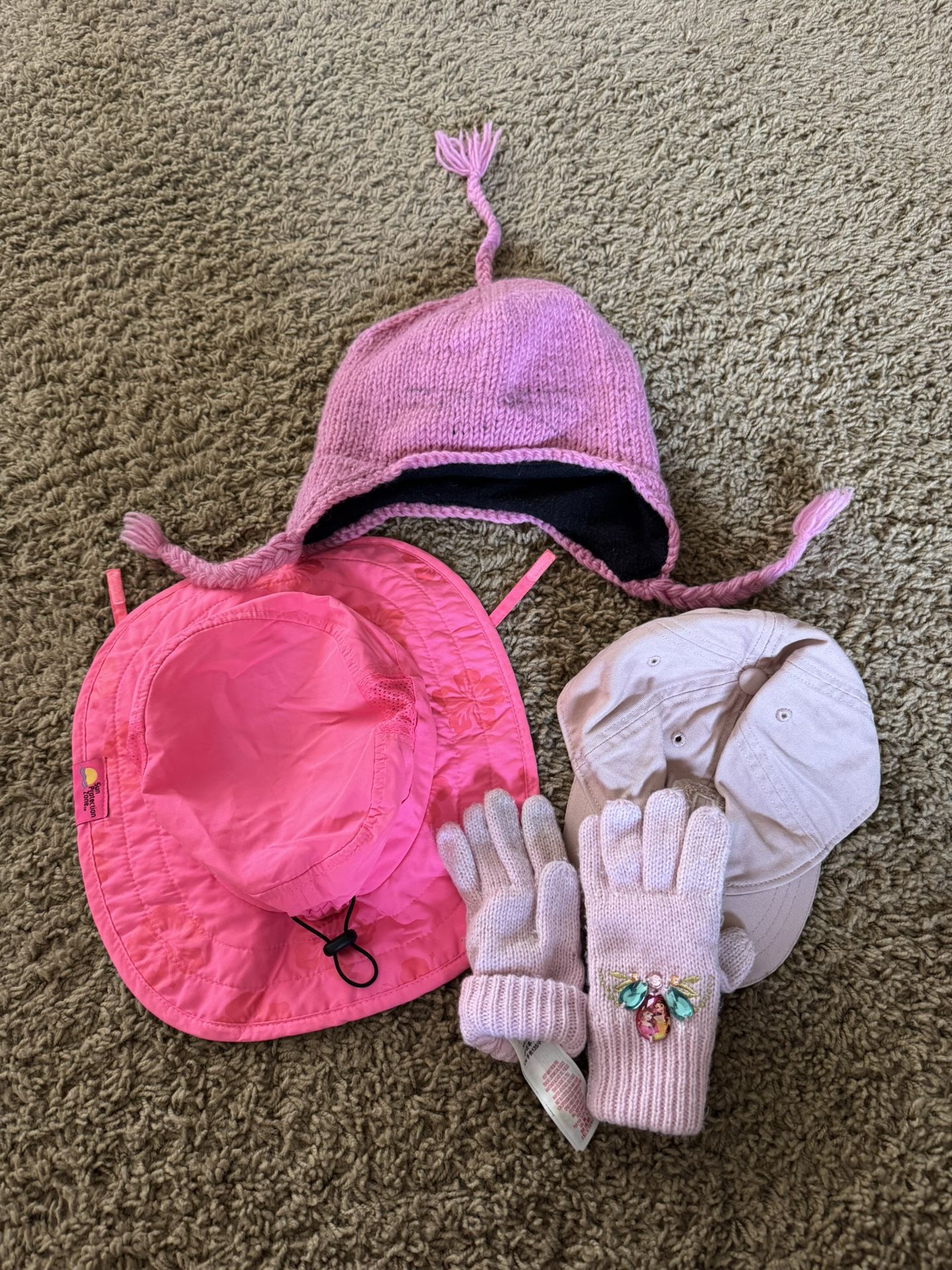 Gap hat size s/m Disney pink gloves xs/s (3-6) Sun protection hat and warm hat- sizes not mentioned but would say 2T-3T