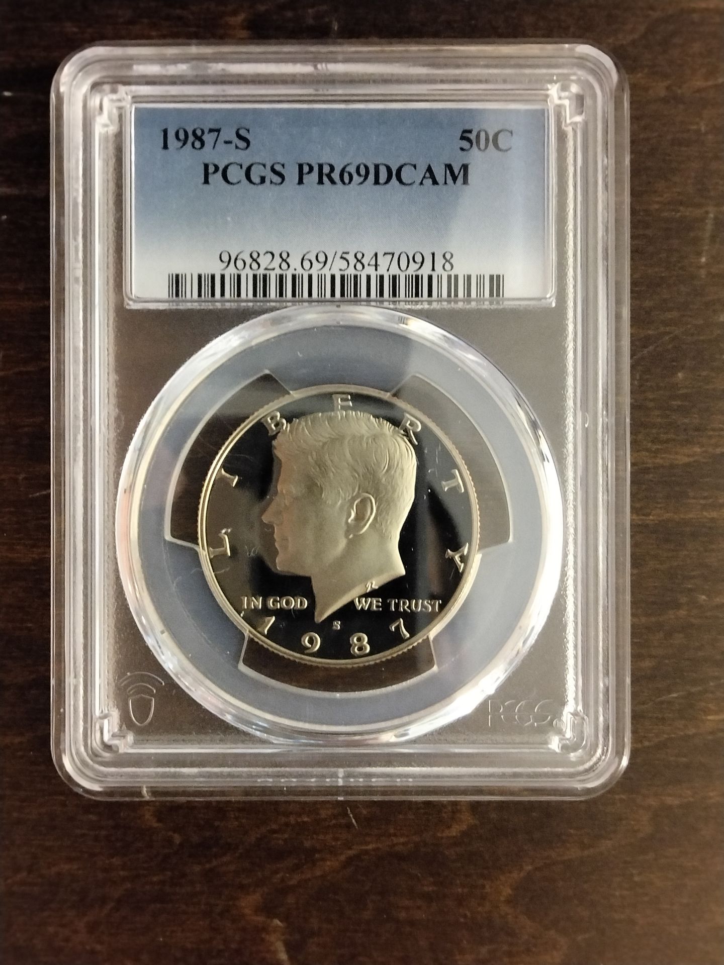 This is a 1987-S Kennedy Half Dollar, a proof coin professionally graded and slabbed by the Professional Coin Grading Service (PCGS). Grade & Designation Grade: PR69 – This is a "near-perfect" grade, meaning the coin has full strike and original luster, with only microscopic flaws visible under magnification. DCAM (Deep Cameo) – This refers to the intense visual contrast between the frosted, white-looking portrait and the highly polished, mirror-like background (fields). Production Context Mint Mark: S – Struck at the San Francisco Mint. Not for Circulation: In 1987, the U.S. Mint did not produce Kennedy Half Dollars for general circulation; they were only available in Mint Sets and Proof Sets. This makes even "business strike" 1987 halves scarcer than other years, though this specific coin is a high-end proof intended for collectors Coin Specifications Composition: Clad (75% Copper, 25% Nickel outer layers over a pure copper core).