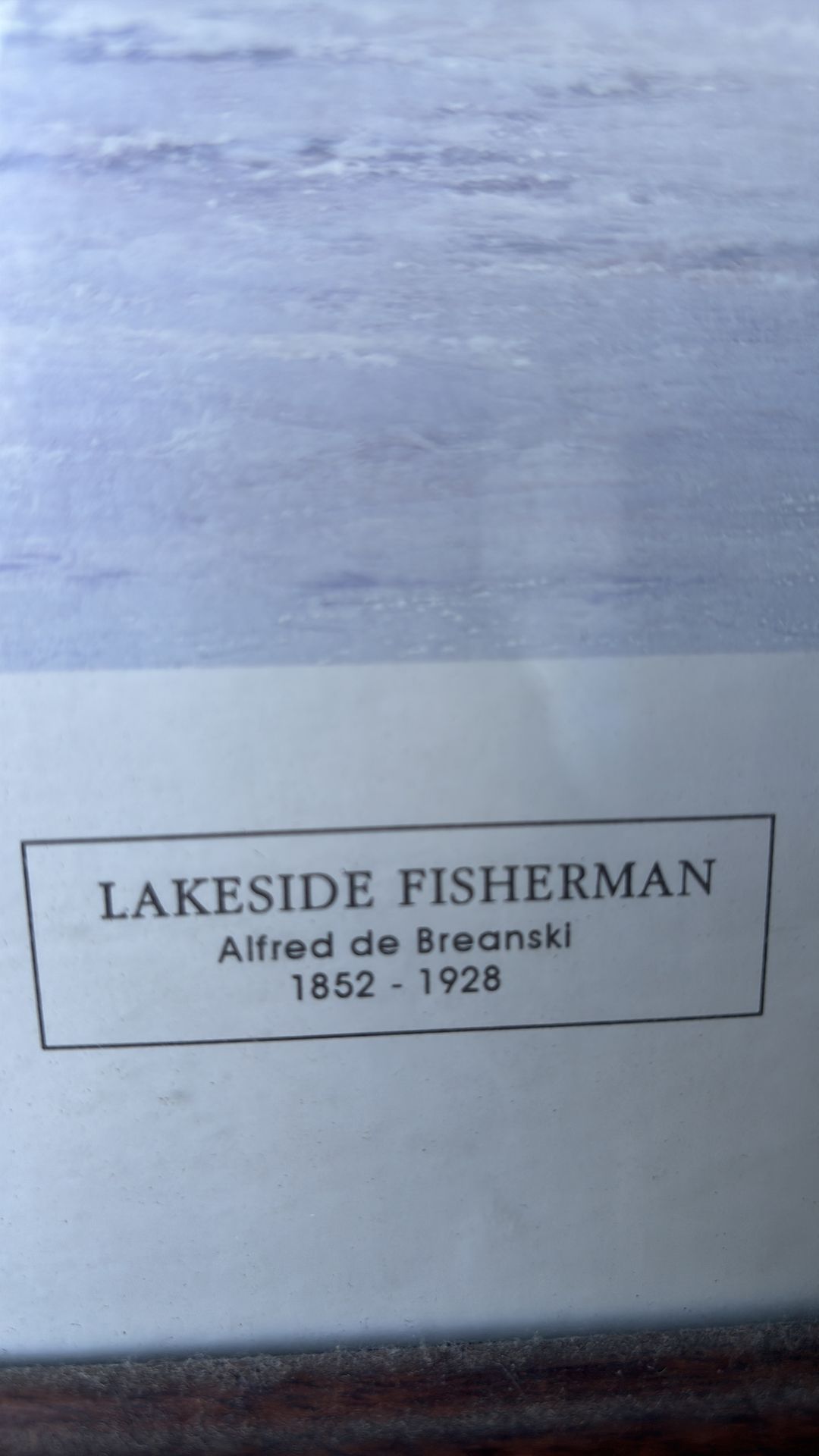 Lakeside Fisherman" by Alfred de Breanski (1(contact info removed)), as original painting NEW 16X20 FRAMED PICTURE OF LAKESIDE FISHERMAN. THE FRAME MOULDING IS 1 3/8" WIDE AND THE COLOR IS WALNUT. THE OVERALL FRAME SIZE IS 18X22. THERE IS A GLASS OVER THE PICTURE. THERE IS A DUST COVER OVER THE BACK OF THE FRAME AND THE WIRE HANGER IS ATTACHED. THE FRAME IS WOOD AND IS CUSTOM MADE IN OUR SHOP.