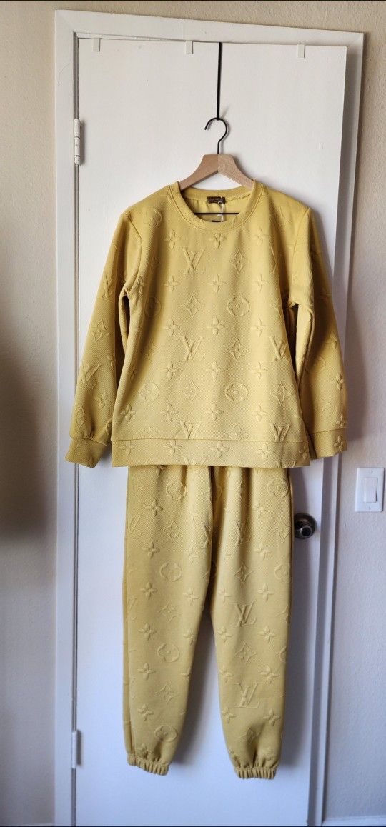 Thick material/very good quality Can fit up to Large, some stretch Round neck top, garterized pants Embossed logo