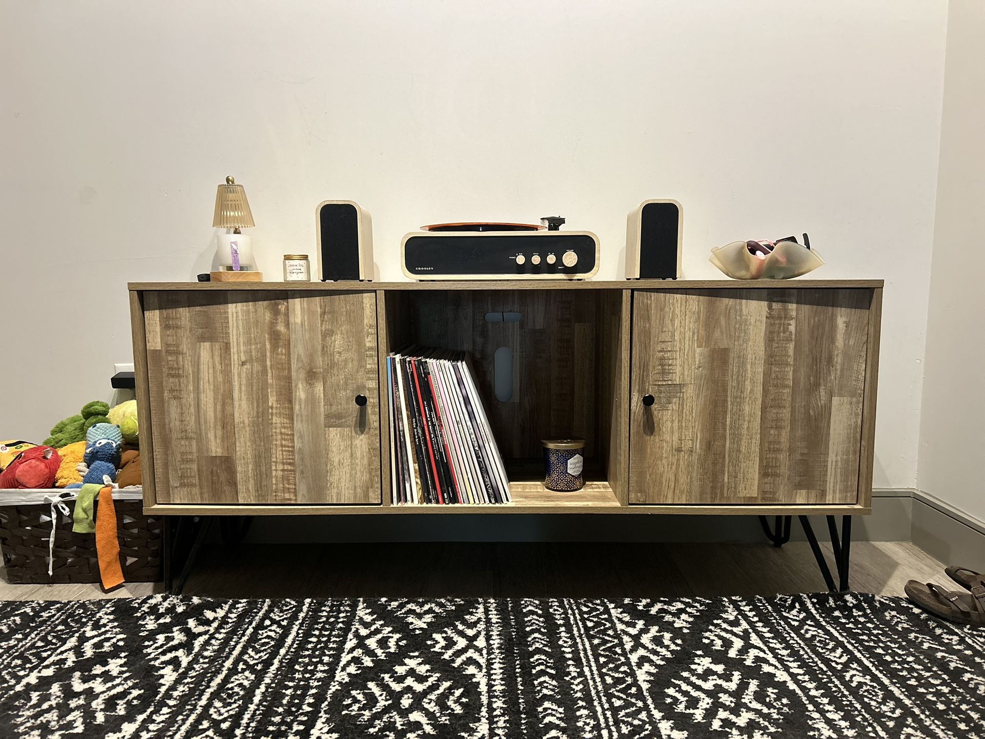 Measurements are shown in photos. Good condition has an extra board for the middle piece. Record player sound is off somehow but if you know how to fix it, you can have it.