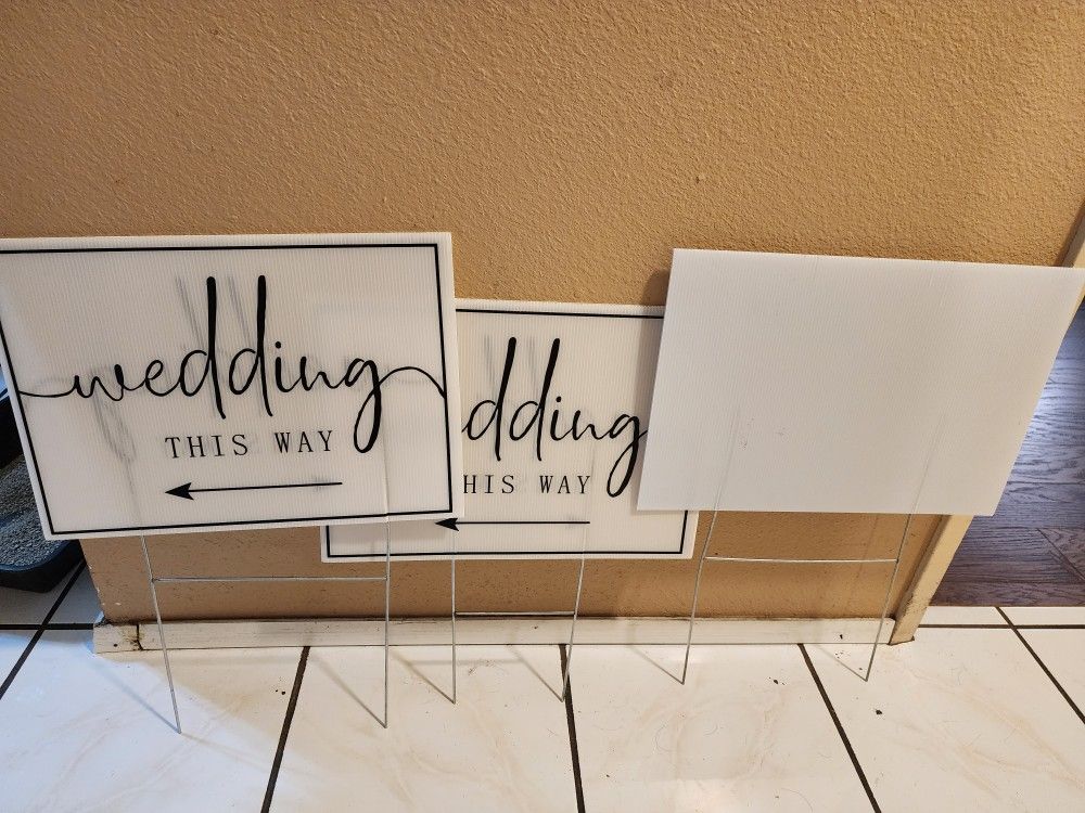 4 signs, 2 shows wedding this way with an arrow (arrow point same direction on front and back), and the other 2 signs are blank. Only 3 metal posts available.