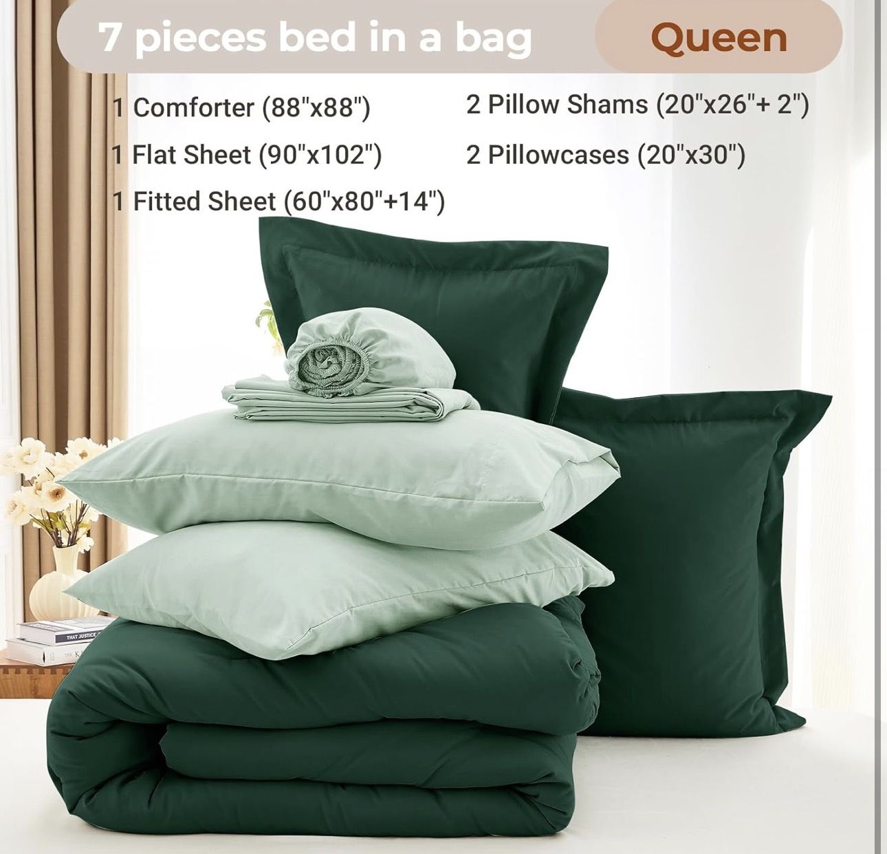 Brand new in box MUXHOMO 7 Pieces Queen Comforter Set, Soft Bed in a Bag Queen Size, All Season Bedding Set with Comforter, Flat Sheet, Fitted Sheet, Pillowcases & Shams, Forest Green & Sage Green Ultra-Soft and Breathable: Crafted from premium brushed microfiber fabric, this queen bedding set offers a soft, smooth and breathable texture, ensuring ultimate comfort for a restful night's sleep Cloud-Like Filling: Filled with lightweight down alternative filling, this comforter provides a soft and fluffy feel that mimics the warmth of natural down without the added weight, making it ideal for year-round use Thoughtful Details: Our bedding set includes a fitted sheet with an elastic 14" deep pocket to ensure a snug fit on almost mattresses, and the envelope closure pillowcases helps keep your pillows secure, keeping your bedding in place all night Complete 7 Pieces Bed in a Bag Set: The MUXHOMO queen size comforter set includes 1 comforter (88" x 88"), 2 pillowcases (20" x 30"), 2 pillow shams (20" x 26" + 2"), 1 fitted sheet (60" x 80" + 14"), and 1 flat sheet (90" x 102") Easy Care: This comforter set is machine washable, just wash it on a gentle cycle in cold water. Please dry quickly on low heat, making it perfect for everyday use. Enjoy simple maintenance so you can focus on relaxation without any worries