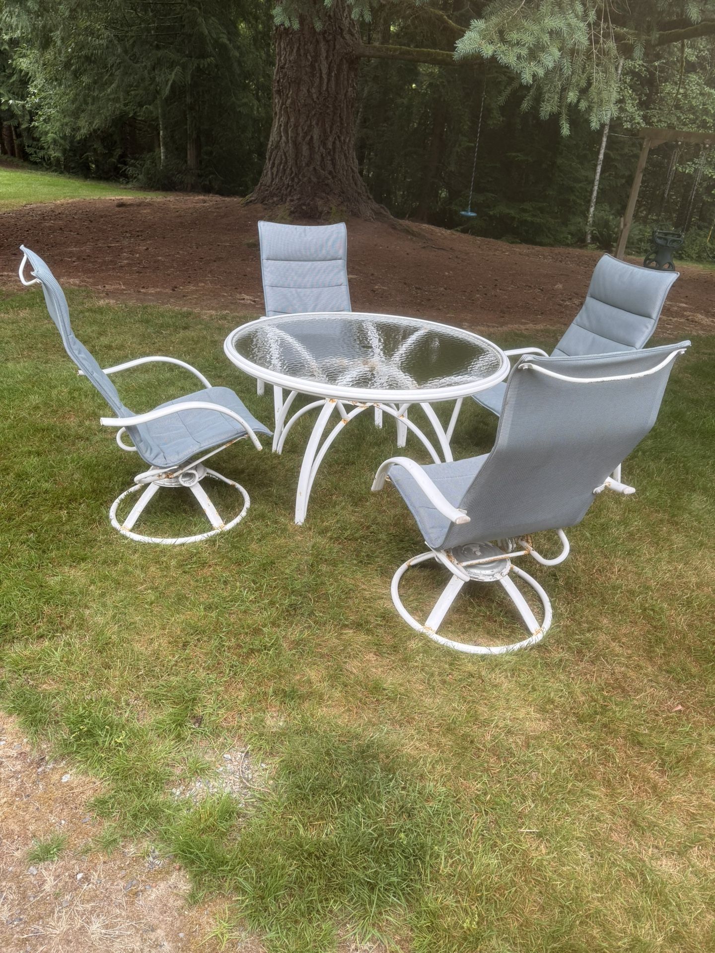 Super comfortable chairs. 2 of them rock and swivel. Glass tabletop is good. White Tablecloth is an extra $7.00. Sturdy. Some rust- could be sanded and painted. Round table Outdoor furniture