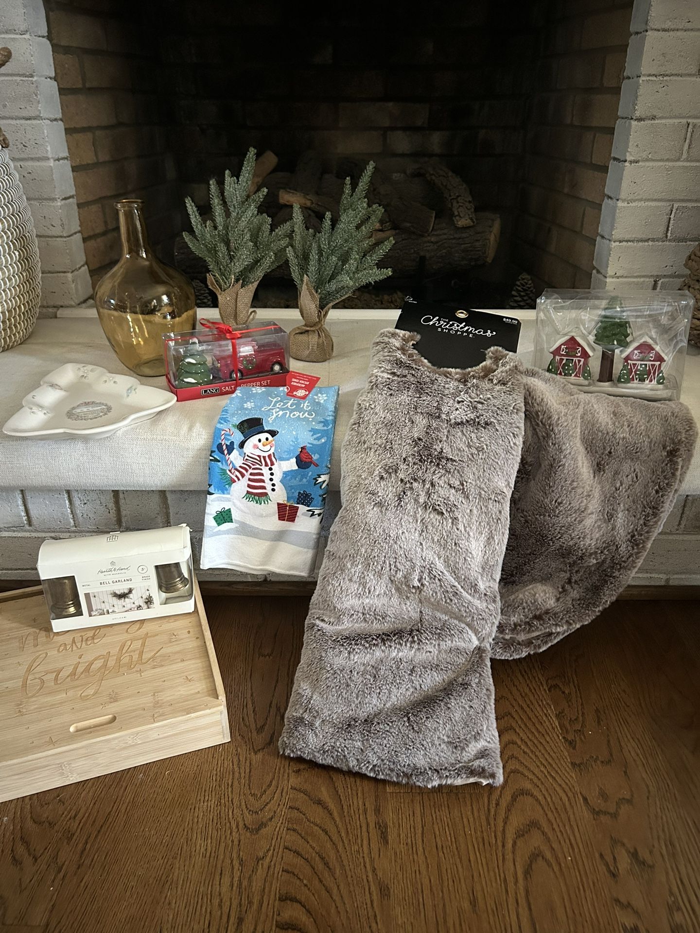 All for $25 or priced individually New Faux fur tree skirt $10 Brown vase $2 Salt and pepper shakers $5 each Bell Garland $1 Kitchen towel $1 Merry and bright wood box $5 Tree plate $2 Mini faux trees $5 for both