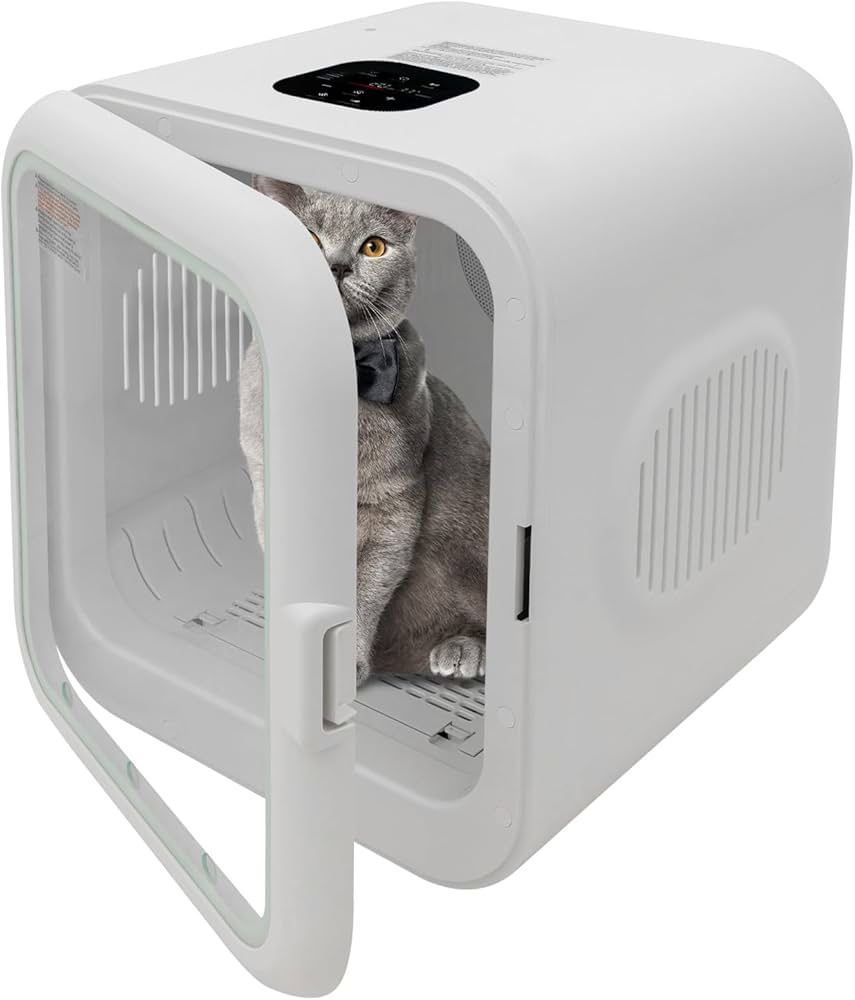 New in box 【Fastest 15-Minute Drying】, 35dB Ultra Quiet Automatic Cat Dryer Box, 360° Full Body Drying, Removable Base, with Light and Skylights 【Sturdy and Durable】 It is made of high-quality ABS, plastic, tempered glass with an injection molding process which has good toughness and formability, making it anti-scratch, and resistant to wear, ensuring its long service life. 【Powerful Function】 The power of each unit is 800W, which can efficiently and dry pets. In addition, the product has an extra-large display for temperature adjustment and timing, so you know exactly how the product is running. 【Adjustable Design】You can set the temperature (71.6-113°F) and drying time (10-180min) through the operation panel according to different usage requirements. Even at the highest temperature, it is relatively safe for cats. 【Low Noise】 The working noise of this product is only 35 decibels, which is equivalent to a soft voice in an indoor conversation, allowing your pet to completely get rid of the fear of noise during the drying process! 【Large Capacity】 The size of 18.5*16.9*18.11inches, high-quality material, and stable structure make it accommodate kittens weighing up to 22.05 lbs and puppies weighing up to 16.53 lbs, meeting your kitten or puppy's drying needs. Besides, you can put toys in it and use it as a long-distance pet carrier, allowing pets to move more freely.