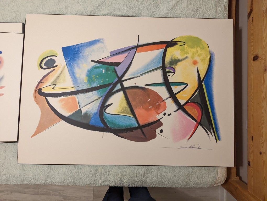 Beautiful abstract art by Gockel. 3 painting Size and Name in order: "Pay Off" - 54.25 x 38.25 "Aw" -27.50 x27.50 "Miro" - 23.62 x31.25 Framed on wood canvas, black trim. Price for all 3, retails well over $1500