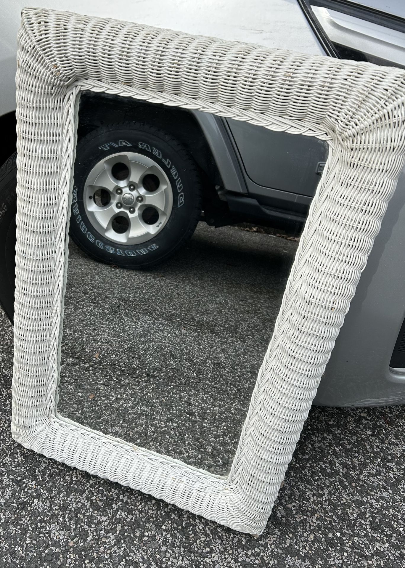 Beautiful rectangle white wicker mirror, measures approx 24 x 37.