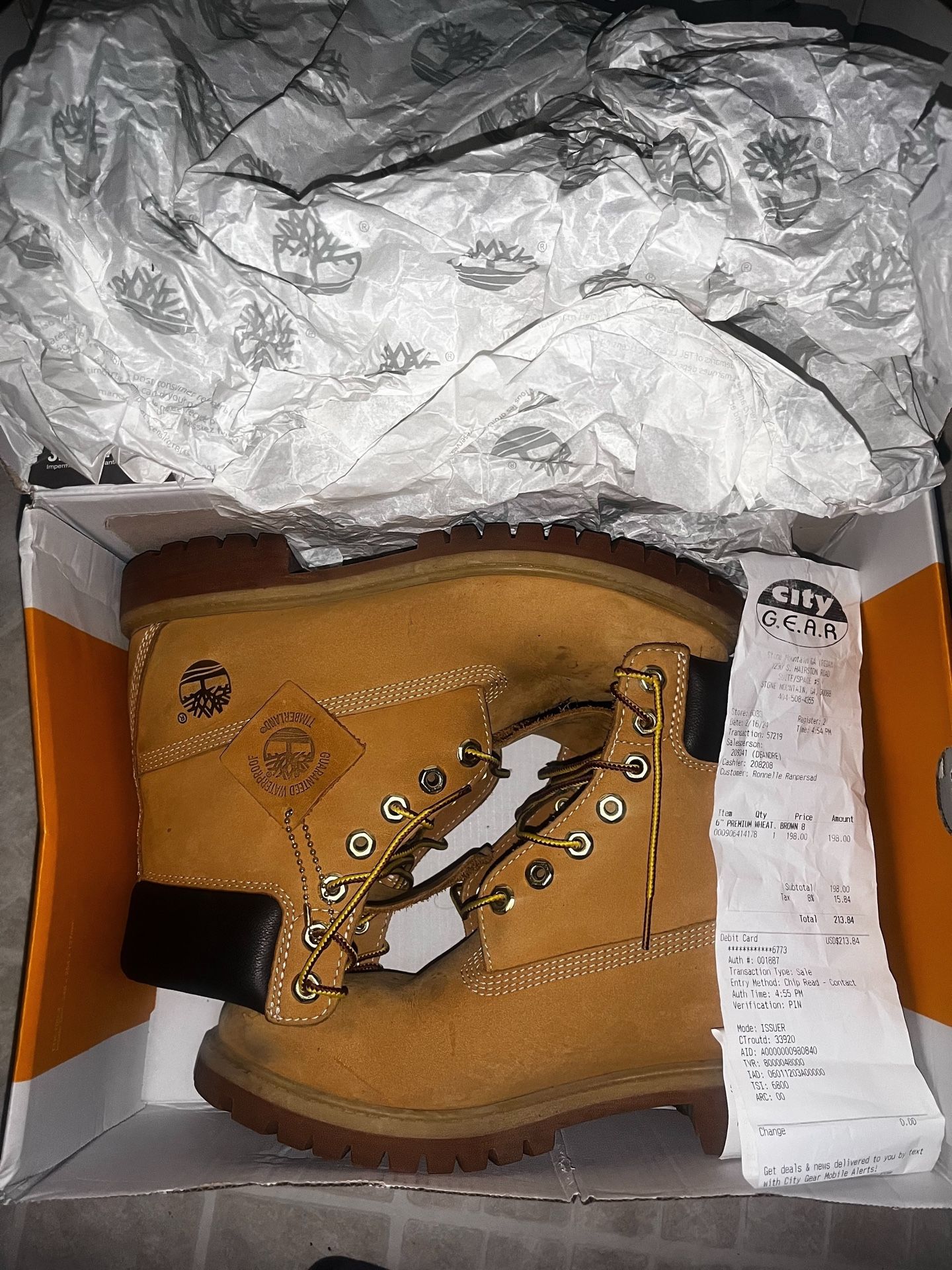 Timberland Premium 6-Inch Waterproof Boots in classic wheat color. Comes with original box, receipt, and original packaging. 100% authentic. Boots are in great condition. Just minor scuffs from normal wear, nothing major. Soles are still strong with plenty of life left. These are the premium waterproof version with double sole, not the cheaper version. Very durable and comfortable. • Waterproof leather • Double sole (extra durability) • Padded collar • Strong rubber outsole • Classic Timberland style Clean pair, well taken care of