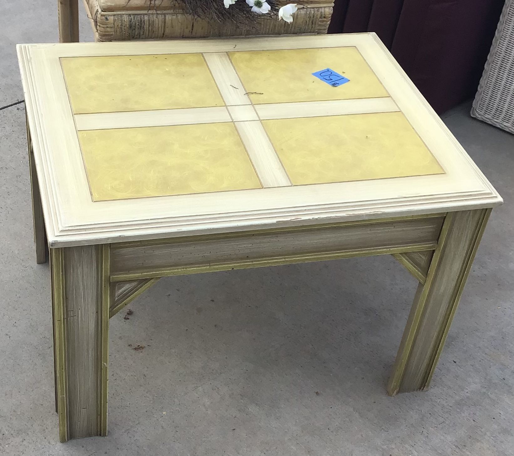 20.25 in. h x 30 in. w x 24 in. l wood table with a 4-section design top and geometric detailing. All sales final, no returns, refunds, or exchanges