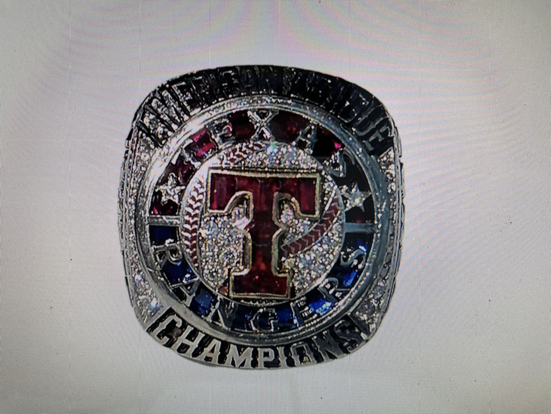 Texas Rangers authentic American League championship Ring.. 10K white gold with 150 real diamonds and rubies and Blue sapphires.. Ring is from the 2011 season. Iconic World Series that came down to the last pitch in game 7.. Ring is size 12.. This is a players ring #55 pitcher Valdez. Comes with the 2011 players official team photo ALCS and also Merkin Valdez Top prospects signed rookie baseball with authenticity. And rookie card.. Complete beautiful set.. CEO Nolan Ryan..