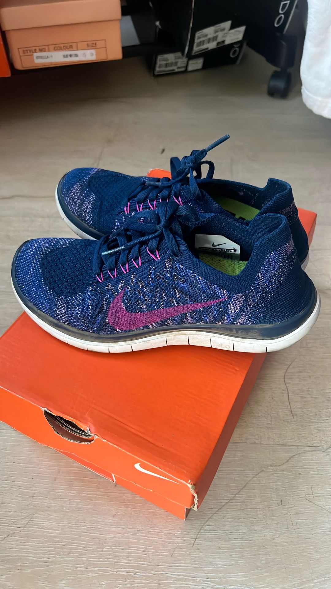 Used. Quite dusty. Needs a good cleaning but in great condition. Front of right shoes has a bit of the navy color rubbed off. No tears on fabric. Size 6. Pick-up & cash only.