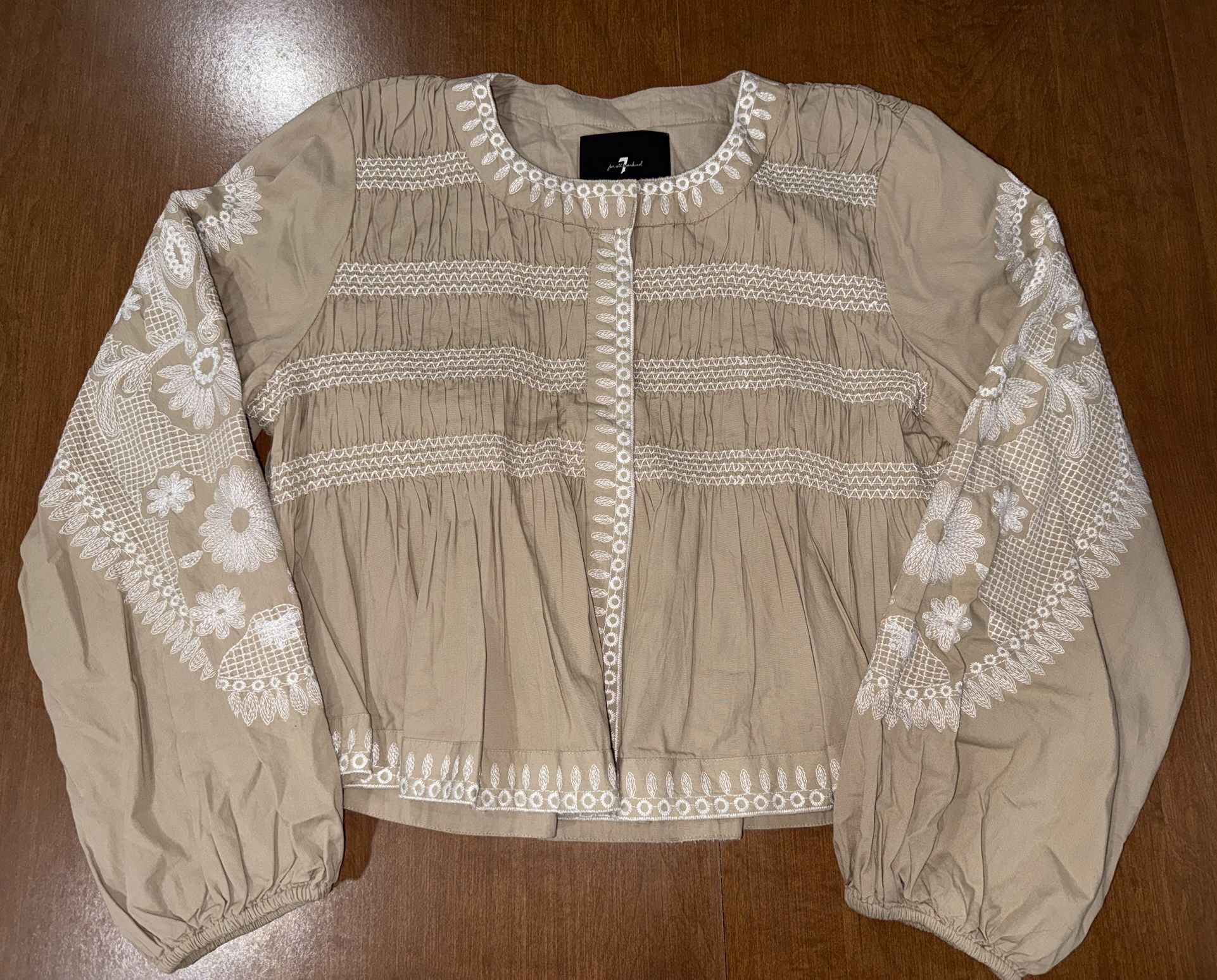 Excellent used condition Women’s snap button blouse/jacket Women’s size large Crop style, beautiful embroidery, cinching throughout entire top $15 firm Pick up only Riverside
