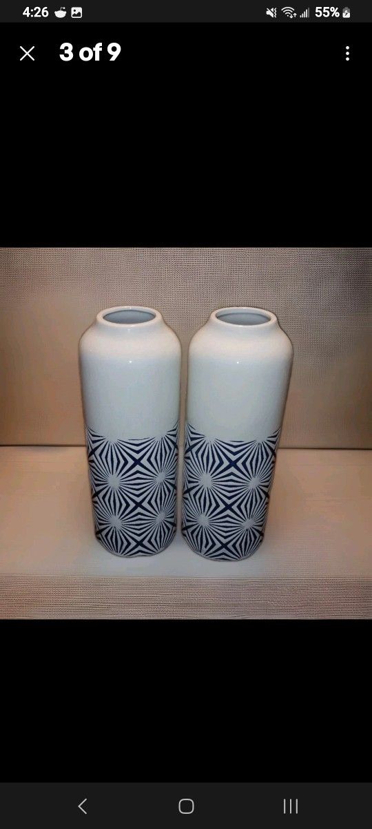 selling set together These are White/DarkBlue Starburst hand Carved Column Vases made of Porcelain or Ceramic. It stands 12 inches tall, has a diameter of 14 inches around, and features intricate carvings. The opening of the vase measures 2 inches. This decorative collectible is a visually striking piece suitable for displaying flowers or as a standalone decor item. this price is s steal!!! Will entertain reasonable offers
