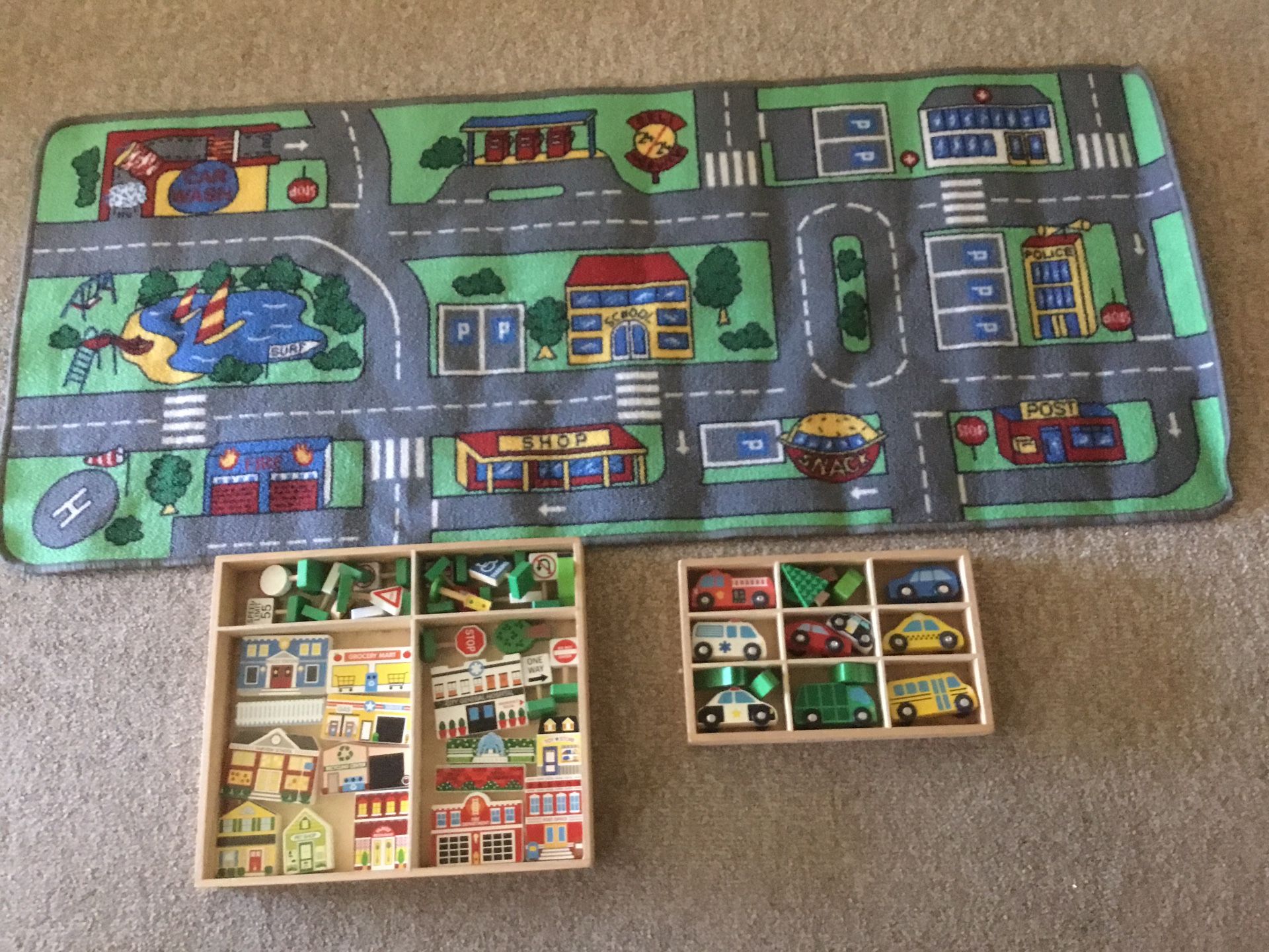 City play rug with buildings, cars, signs and trees. $40.00 cash only.