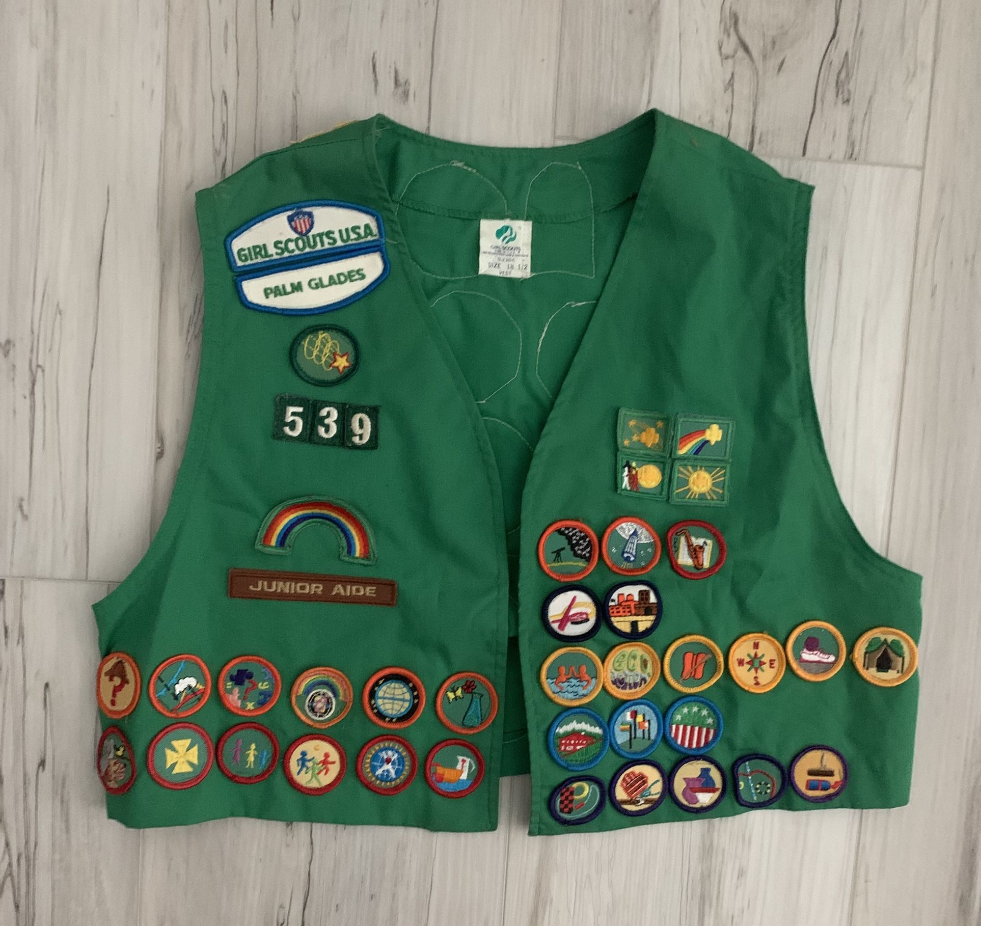 1990’s official Girl Scouts vest. Size is youth 18.5. Vest has 74 patches and one medal