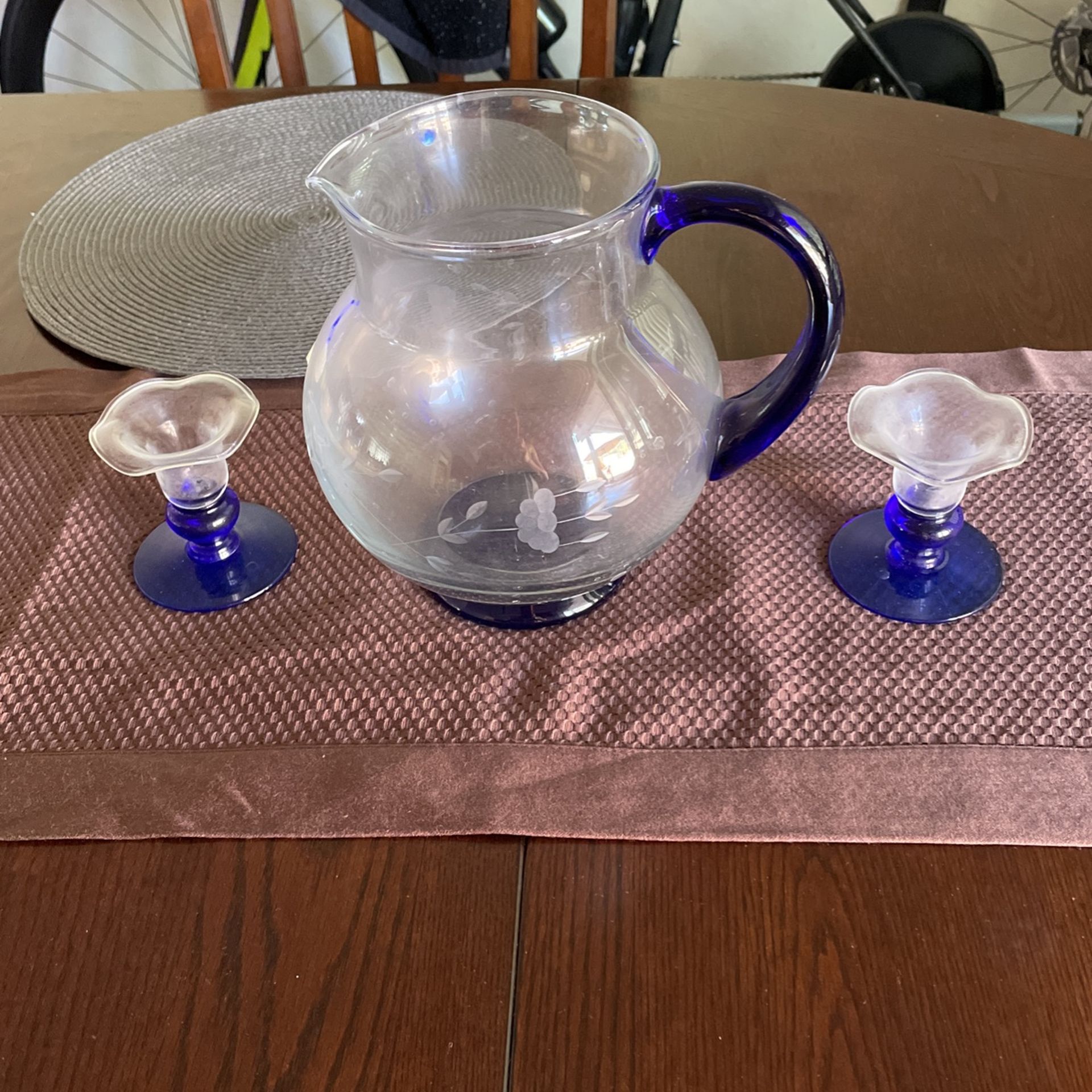 Vintage Princess House Heritage Large Pitcher with Cobalt Blue Handle and Base Vintage Princess House Heritage Set of 2 Candle Holder with Cobalt Blue Base was purchased year 2000, never used just stored in the storage for long. NO ORIGINAL BOX but will provide good packaging!