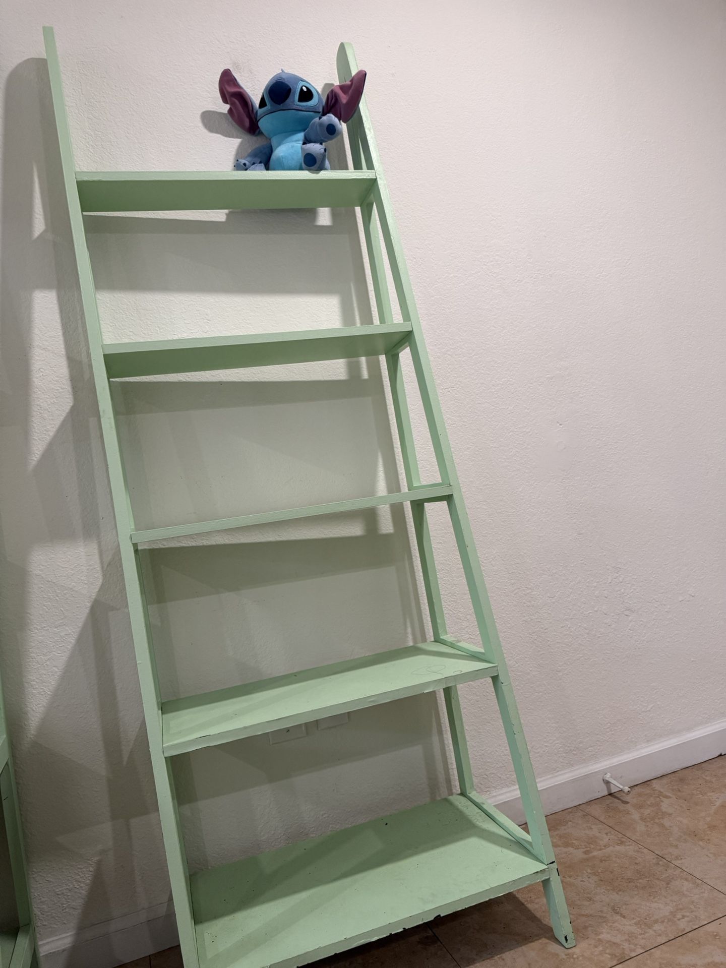 Two Identical Ladder Shelves 14 in L x 23 in W x 71 in H Solid wood. Good for nursery. Can be easily painted to a different color. $40 each