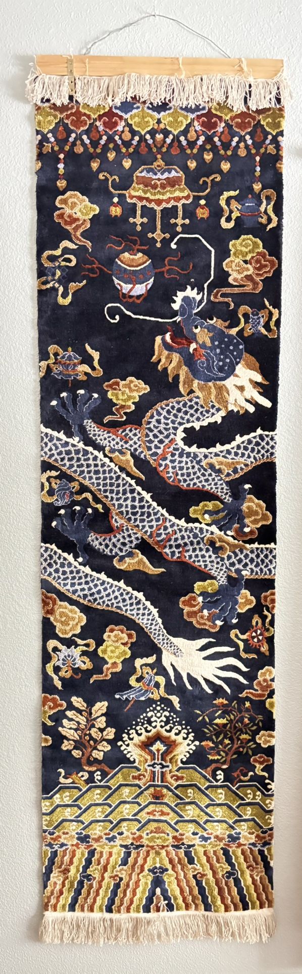 Most of the floors in the imperial palace in Beijing are tile or stone, so rugs provided welcome relief during the long, cold winters. Rugs were used for more than just covering floors, they also decorated columns and other architectural elements. Most were wool and were made in the northwestern province of Ningxia. They tend to feature large, bold designs in red, blue, or brown on a yellow background. Dimension 84” x 24”