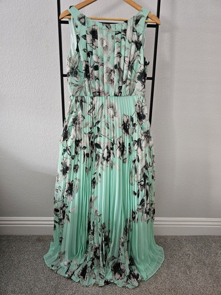Beautiful Eliza J maxi gown in mint green with black & white floral print. Flowing pleated skirt gives it an elegant, timeless look. Size 6 Sleeveless, scoop neckline All-over floral print Floor-length pleated skirt Back zipper closure β¨ Condition: Excellent, worn once. β¨ Retail ~$200 Perfect for weddings, birthdays, formal events, or spring/summer parties. This dress made my birthday unforgettable β I hope it brings joy to your special occasion too. πΈ