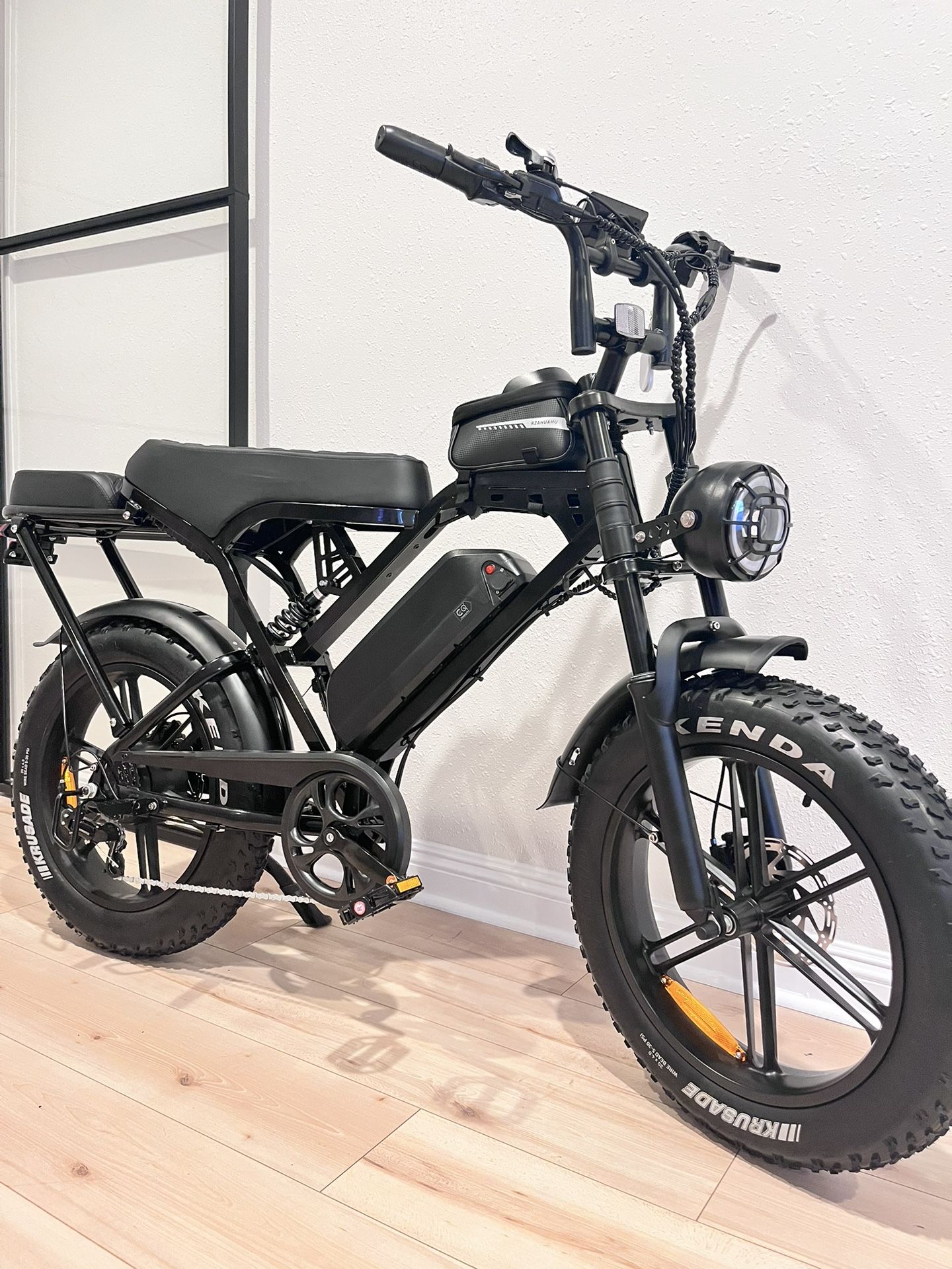 New IN BOX 📦 Comes with: rear pegs, phone holder Pouch 📱chain lock 🔒, NFC Card, Front Basket Rack Detachable Rear Sear NFC/Key Fob-Lock/Unlock In App Bluetooth Battery key lock Remote/Alarm installed in bike MOTOR POWER‼️1000W Peak 1500W Max Speed: 32mph Range: 35-40 miles Removable Battery: 48v 15🔋 Hydraulic Brake 5 Riding Modes 7 Speed Change Charger: 54.6v 2AH 🔋⚡️⚡️ Water resistant: IP54 💧 All-Terrain Off-Road 20 Inch Fat Tire 🛞 Suspension: Front and Rear Suspension Twist Handle Throttle Rear Break Light Signal Turning Lights LCD Display Screen Double Shock Absorption LED Headlamp Detachable Battery Brushless Motor Pedal Assist