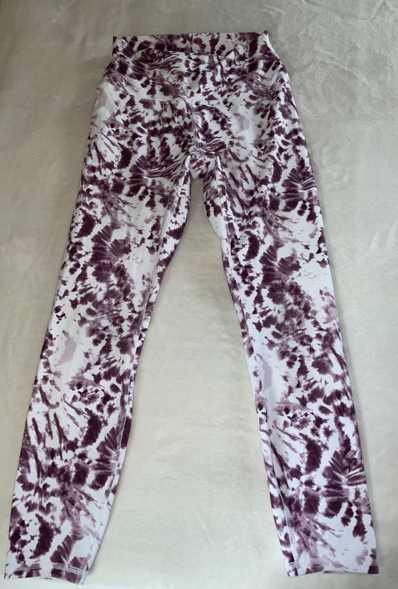 . Purple and white tie-dye print with wide waistband. Made of 75% polyester and 25% spandex. Soft, stretchy activewear fabric. Pre-owned in good condition.