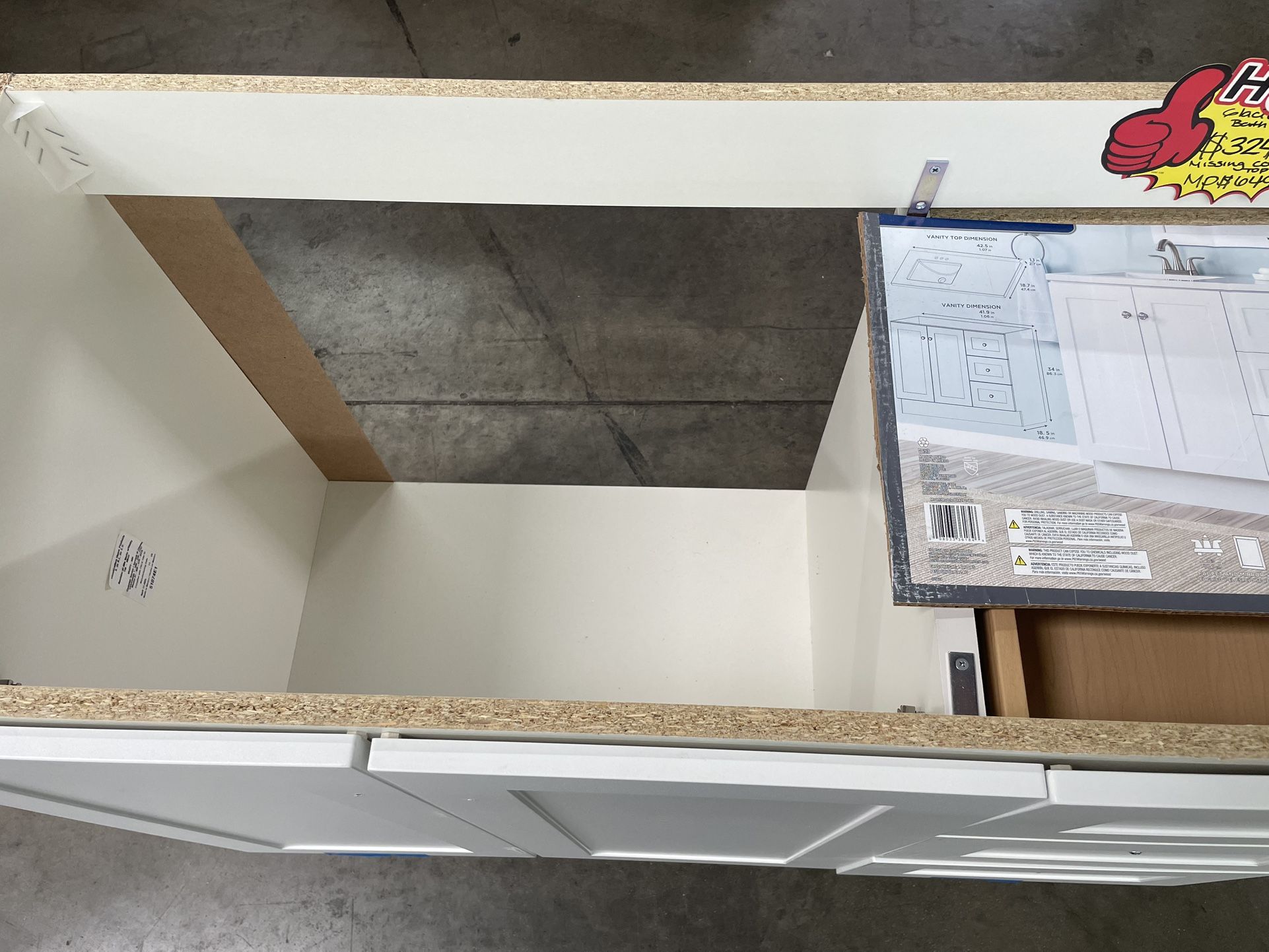 Market price $649 No counter top The 42.5 in. W Bannister bathroom vanity in white includes a below-the-sink 2-door cabinet, full-extension side drawers, and a 1-piece cultured marble vanity top. Contemporary in style, this white vanity features a full-overlay Shaker profile, ornate satin nickel hardware, and a Colorpoint white sink top that gives the look of granite with blue-gray flecks on an off-white base. The cultured marble sink top also includes an integrated rectangular white sink that's offset to the left, providing open counter space on the right.Created with convenience in mind, this pre-assembled bathroom vanity features an open-back design, 6-way adjustable hinges, adjustable drawer fronts, and an unattached vanity top for easy plumbing access. 42.5 in. W x 18.75 in. D x 35.14 in. H bathroom vanity maximizes storage in your main bathroom or powder room Colorpoint white cultured marble vanity top with a 1.13 in. edge profile is predrilled for a 4 in. centerset faucet; faucet and drain sold separately Integrated rectangular white sink with no overflow hole to help promote a bacteria-free environment Satin nickel door and drawer hardware included 2-door cabinet and 3 full-extension side drawers for convenient storage Shaker style vanity profile in a white cabinet finish Colorpoint white vanity top features a very light gray base with faint cool gray flecks for a granite-style look Single sink vanity top is nonporous, making it bacteria, mold and mildew resistant Pre-assembled open-back vanity is ready and easy to install with silicone caulking; caulking sold separately Laminate furniture-board construction 6-way adjustable hinges and adjustable drawer faces provide easy alignment after installation; see videos in image carousel Coordinating backsplash, BSCP43-WH sold separately Limited lifetime warranty Slight variations in granite look vanity top hue and pattern are normal