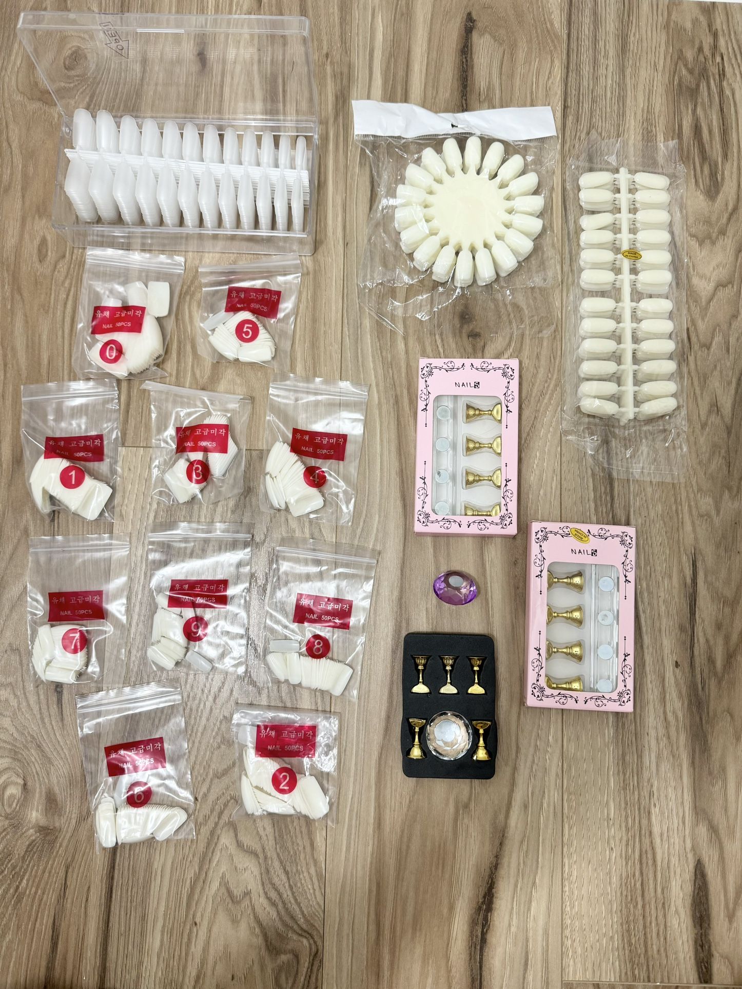 $25 for all nails supplies 19 pairs nails in box(482 pcs) 10 pairs nails in bag 5 pairs nails in bag 3 set nails holder 10 bag of 50pcs nails different sizes