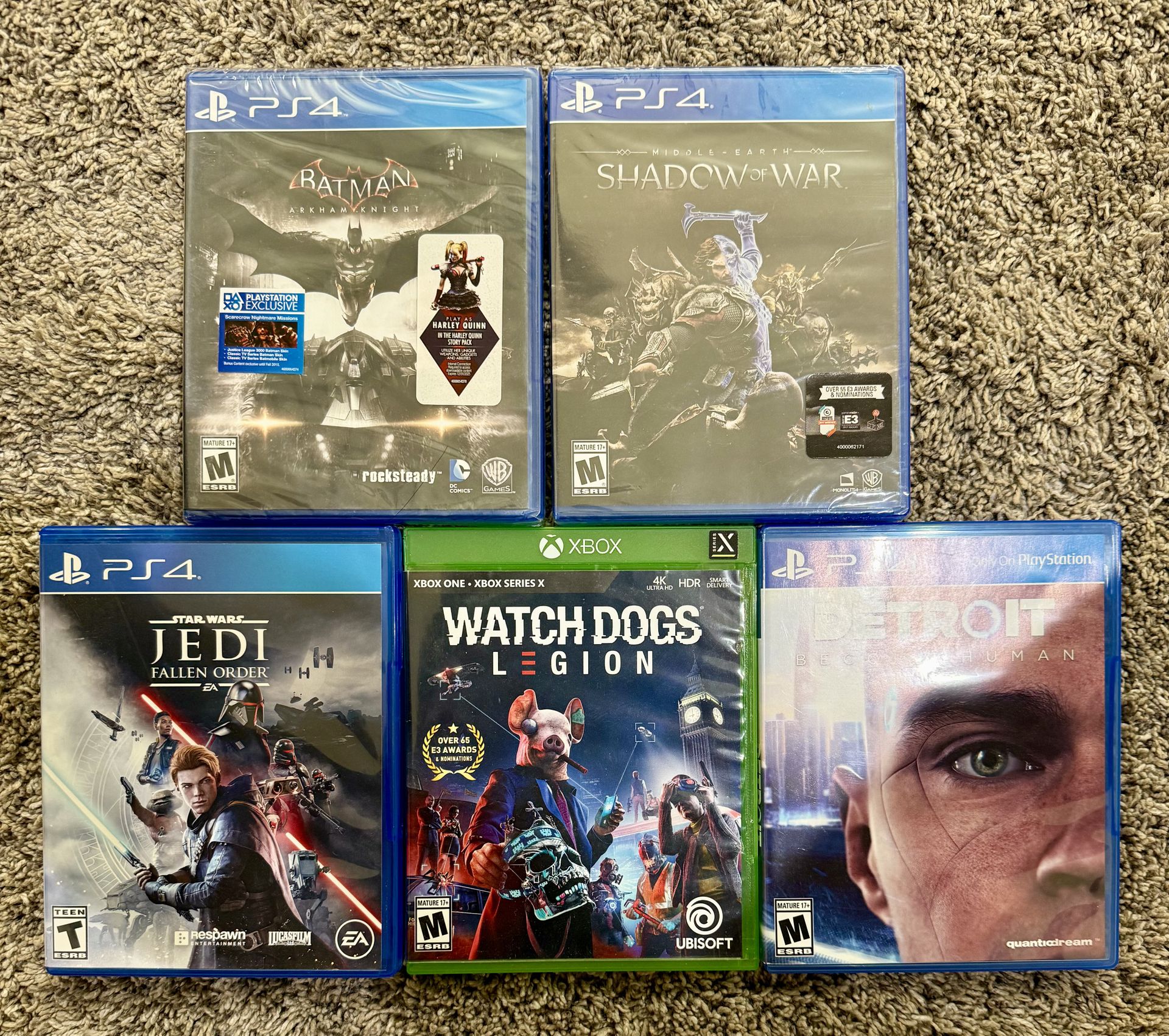 I’m selling this lot of games: - PS4 Batman Arkham Knight - New/Sealed - PS4 Middle Earth Shadow of War - New/Sealed - PS4 Star Wars JEDI Fallen Order - Used - Xbox Watch Dogs Legion - Used - PS4 DETROIT Become Human - Used $20 or best offer