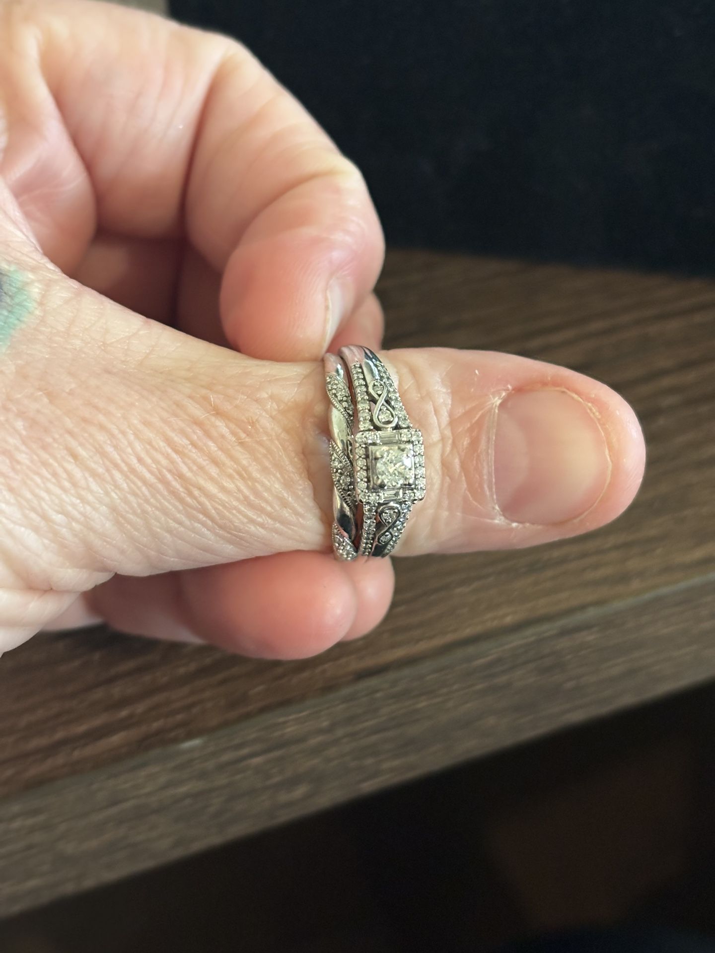 Infinity Engagement Ring 1/2 ct tw Diamonds 10K White Gold. Wedding band is Diamond Anniversary Ring 1/20 ct tw Round-cut 10K White Gold. Free sizing at Kay. Can also purchase warranty from them. Has been cleaned and inspected just last month. Can meet at Kay in superstition springs mall.