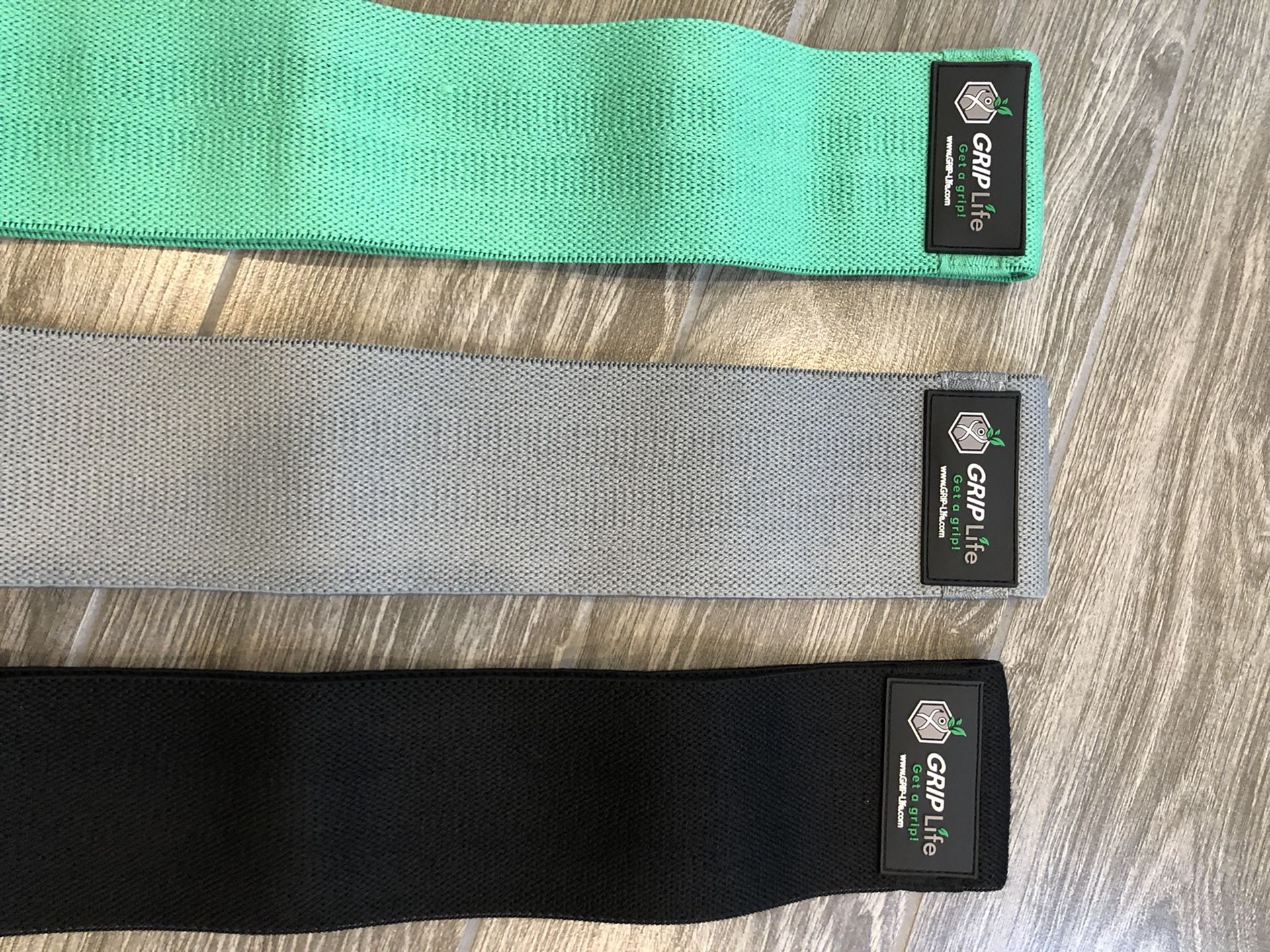 Each set contains 3 resistance bands of various difficulty. Green-light, gray-medium, black-heavy Say no more to bands that slip, slide, and roll during your workout! These fabric resistance bands are soft, comfortable, and feature a nonslip grip. Wear them on clothing or bare skin without the hassle of needing to readjust or feeling it pinch your skin in the middle of a set. Includes: * 3 different resistance bands: easy (green), medium (gray), and difficult (black) * drawstring mesh bag for carrying bands * sample exercise guide Great to add to squats for glute activation, strengthen arms, and tone thighs with these bands. Brand new in original packaging. 3 different resistances: easy, medium, and difficult. Sold as a set with all 3 bands. *Multiple sets available! Great to add to squats for glute activation and home workouts to tone inner and outer thighs. Comes with drawstring bag and exercise guide!