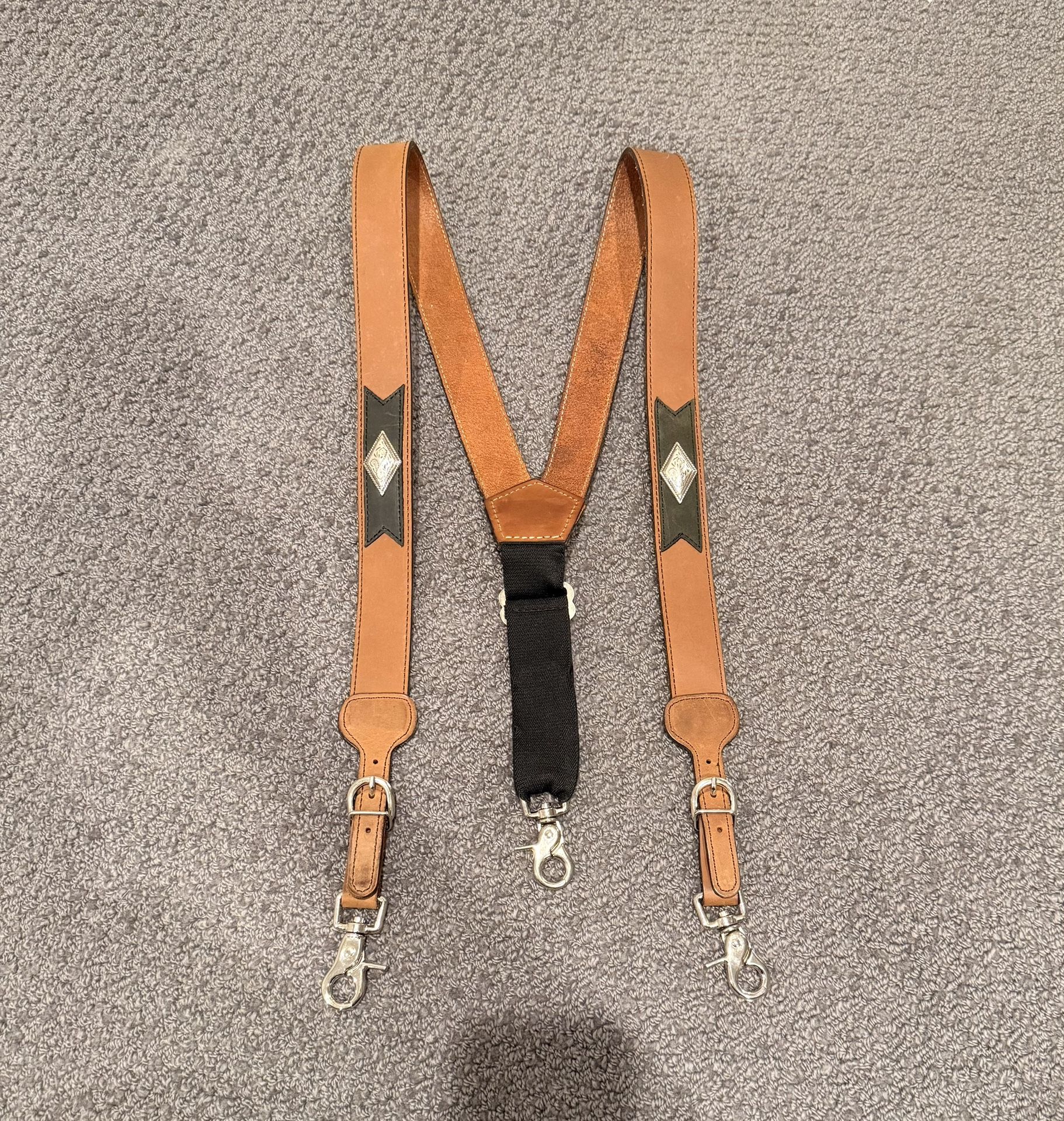 Nocona by M & F Western Products Men's Accessories - Buffalo Concho Suspender - Medium Brown 🔹In good used condition. Only The elastic band on the back is slightly deformed. See the last photo. Top Grain, Heavy Duty Genuine Leather Front, Belt Style Adjustment Back, Sturdy Elastic "Y" Adjustment Rich Brown Leather Straps with Basket weave Pattern on the Billet Silver Buffalo Nickel Concho Accents ‼️ Secures Easily to Belt Loops with Heavy Duty Trigger Snaps Sizes: Medium (28"), Large (30"), & XL (32") This suspender by M & F Western Products features an embossed basket weave pattern and a silver buffalo nickel Concho. One snap on the back and two snaps in the front. Adjustable to get that perfect fit. These conveniently snap to your belt loops. 💙 Elevate your workwear wardrobe with the Nocona Men's Tooled Suspenders. These suspenders effortlessly blend rugged durability with distinctive style, making them a must-have accessory for any hardworking man. Crafted to provide both functionality and flair, these suspenders are perfect for long days on the job site or adding a touch of class to your everyday attire. Product Features: High-Quality Import: The Nocona Men's Tooled Suspenders are meticulously crafted from high-quality imported materials, ensuring superior durability and a lasting finish.