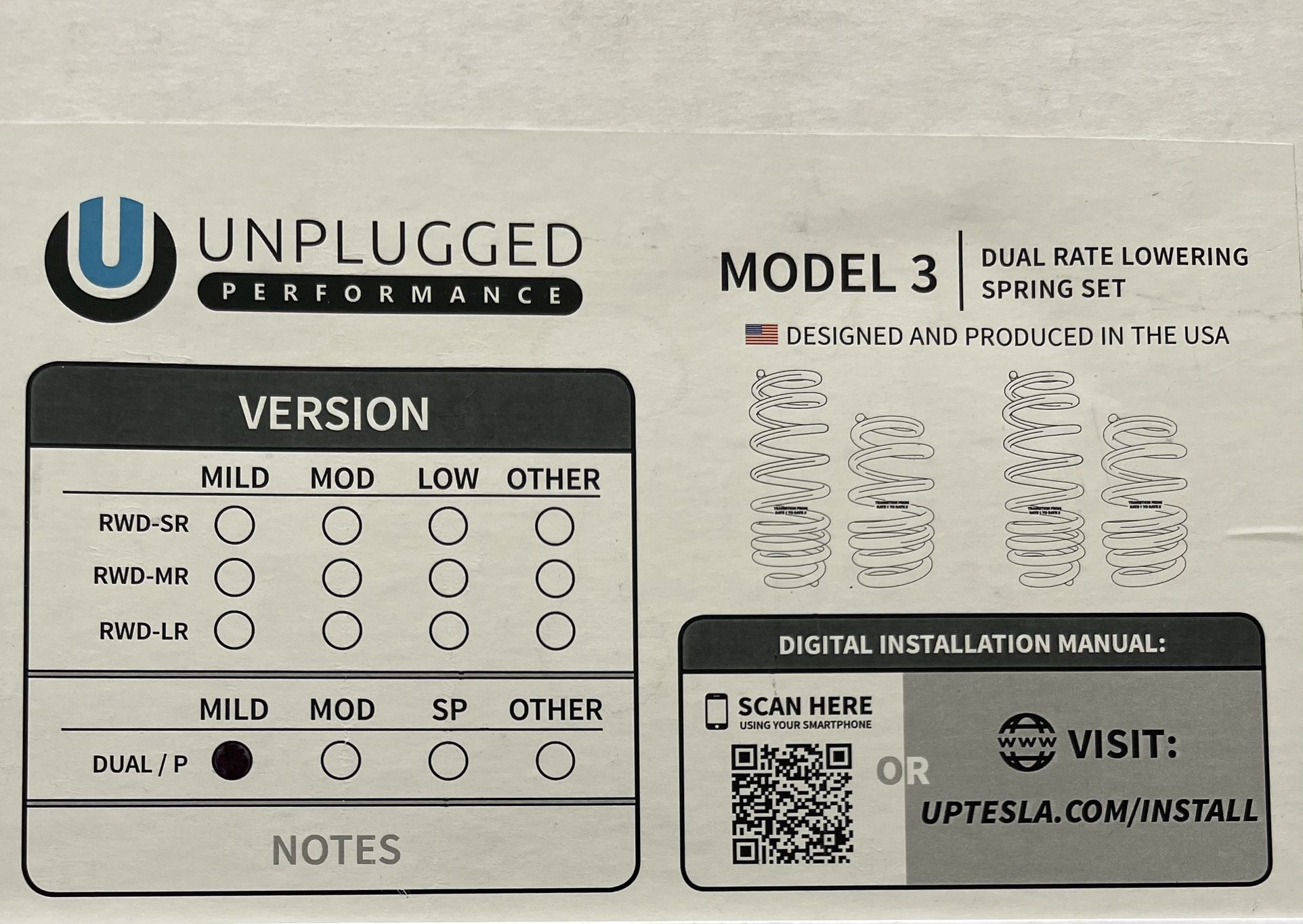 Product Unplugged Performance – Model 3 Dual-Rate Lowering Spring Set Vehicle: Tesla Model 3 Made in: USA Type: Dual-rate lowering springs (progressive) ⸻ Core Specifications (General) • Spring type: Dual-rate (softer initial rate for comfort, stiffer secondary rate for handling) • Purpose: • Lower center of gravity • Improve cornering & stability • Reduce wheel gap • Maintain daily-drivable ride quality • Compatibility: • Tesla Model 3 RWD & Dual Motor (AWD / Performance), depending on version • Dampers: • Designed to work with OEM shocks • Installation: • Direct replacement springs • No cutting or permanent modification required • Alignment: • Alignment recommended after install ⸻ What Your Specific Card Indicates Based on the filled selection: ✔ Vehicle Configuration • Model: Model 3 • Drivetrain: Dual Motor / Performance (Dual / P) ✔ Version Selected • MILD (dot filled under “MILD”) This means you have the Mild Drop Dual-Motor / Performance spring set. ⸻ Typical Drop for Mild Version (Unplugged Performance) (Approximate, varies slightly by year & drivetrain) • Front: ~0.8–1.0 inches (20–25 mm) • Rear: ~0.8–1.0 inches (20–25 mm) 👉 This is their most conservative setup: • Minimal scraping • Very daily-driver friendly • Closest to OEM ride comfort ⸻ Ride & Handling Expectations • Ride quality: OEM+ • Less body roll • Better turn-in • No harshness over normal road imperfections • Ideal for street use, commuting, and spirited driving