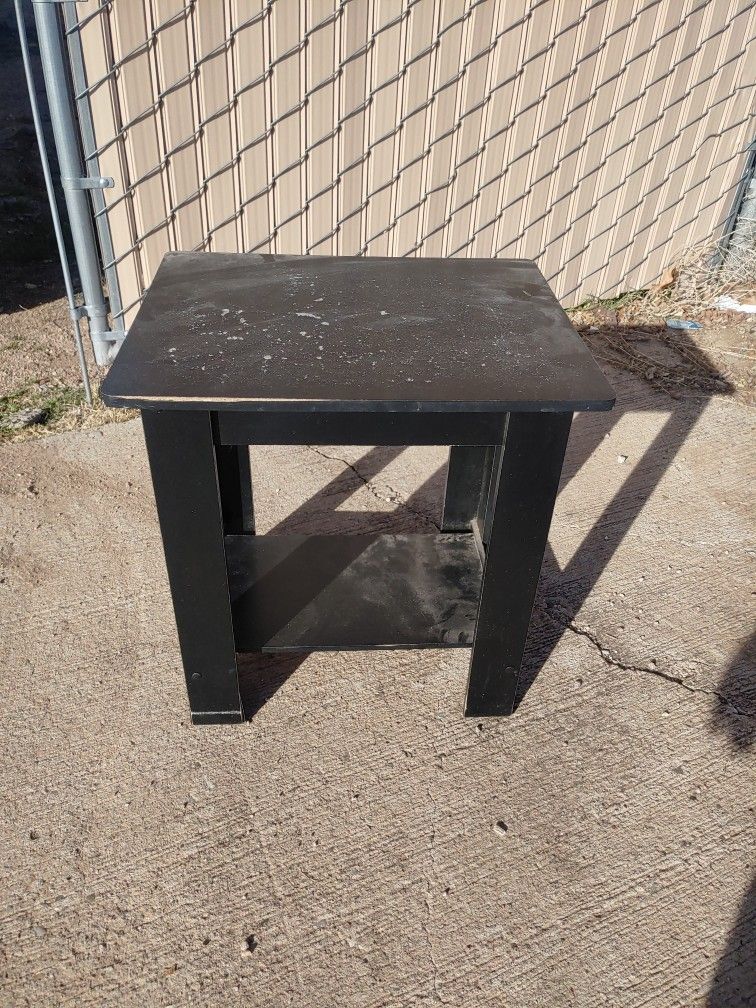 Black wood end table. Decent overall shape for price. Approx 20 inches tall, 15 deep, and 19 wide.