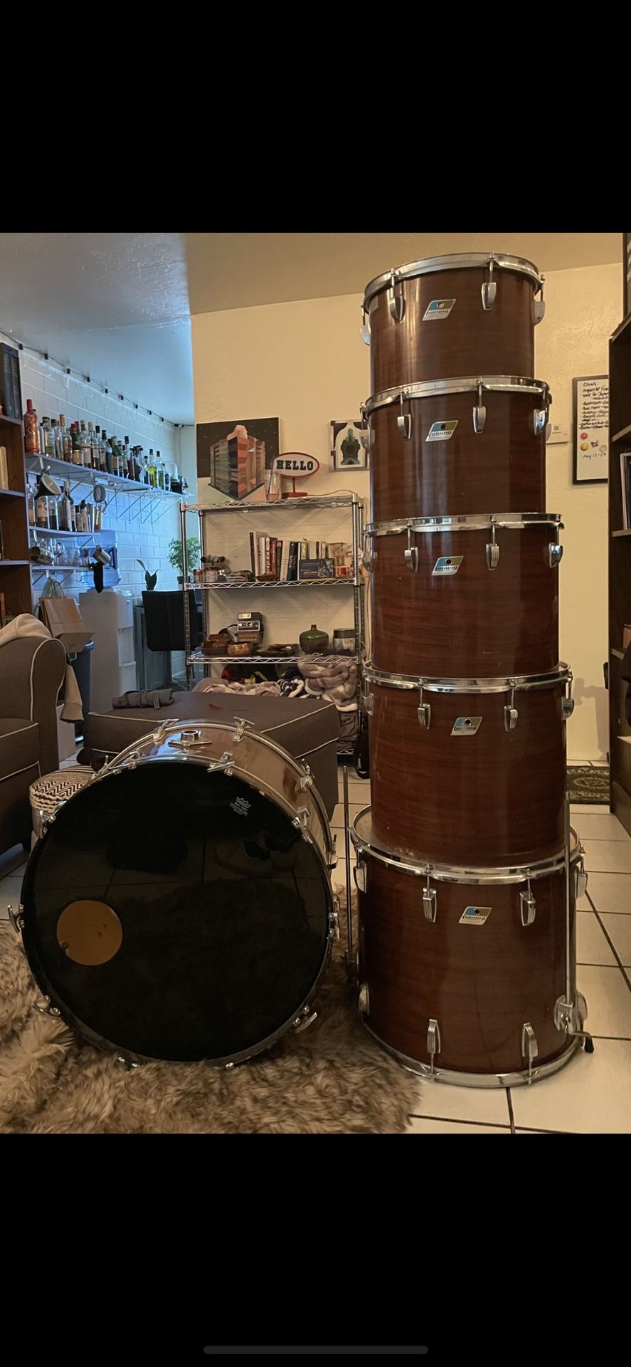 Concert drum kits were meant to have less mics since they are louder. All toms excluding the floor tom are open ended. It’s a great kit with a rich deep tone. Snare, splash cymbal, and hi-hat, included. Zildjian 14” splash, 14” Sabin hi-hats. This is a collectors kit. The clips for the toms are bayonet clips which aren’t made anymore so I used snare stands for two toms which are included. The snare stand and snare are Mapex. All other hardware (cymbal stands, snare stands for toms) are generic brand hardware. Does not include bass drum pedal. Shell sizes: bass 24”, floor 18”, toms 16” 15” 14” 13”