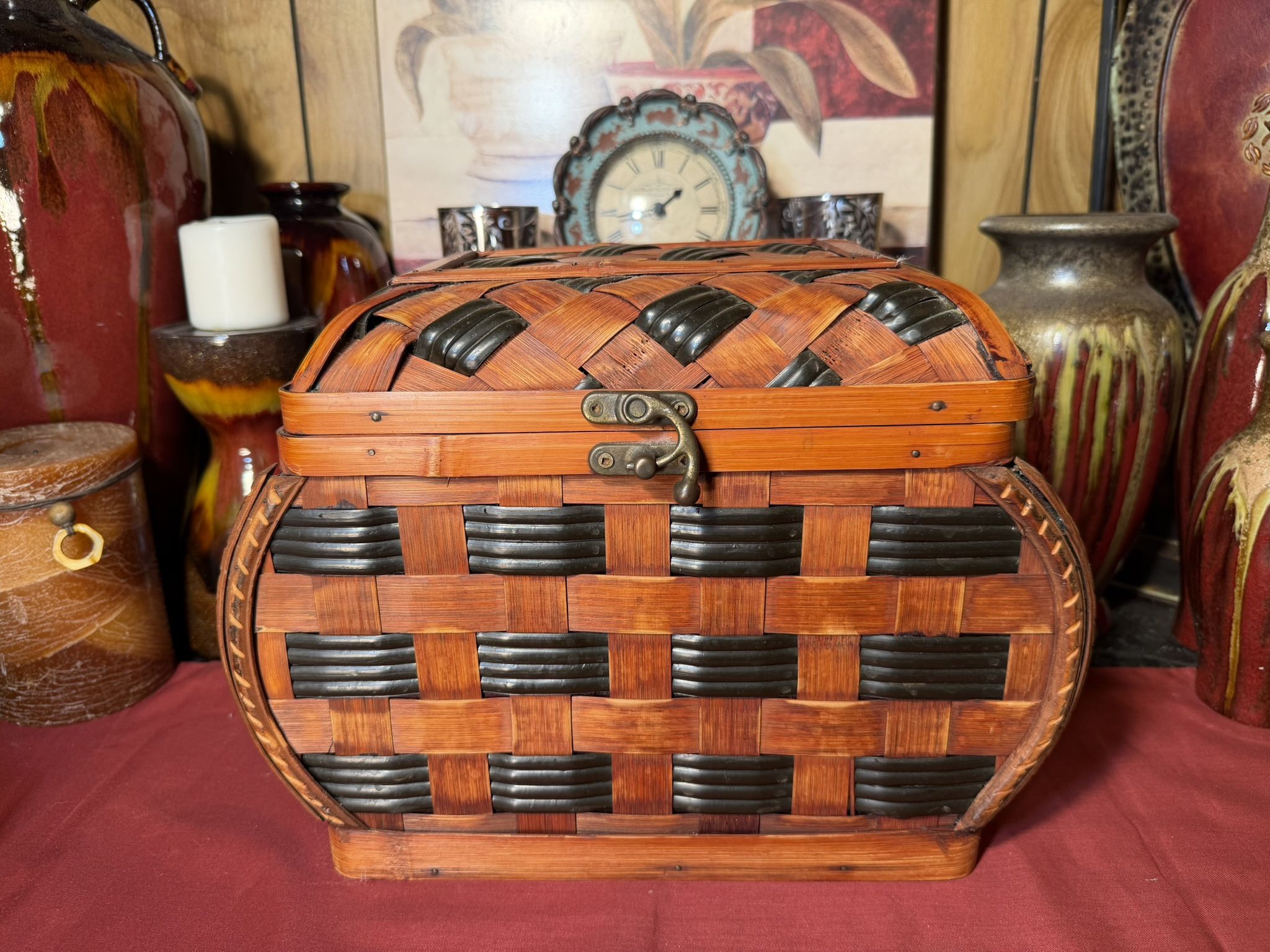 Vintage Woven Picnic Basket And Metal Latch Storage Chest 13.5” X 8.5” X 10”