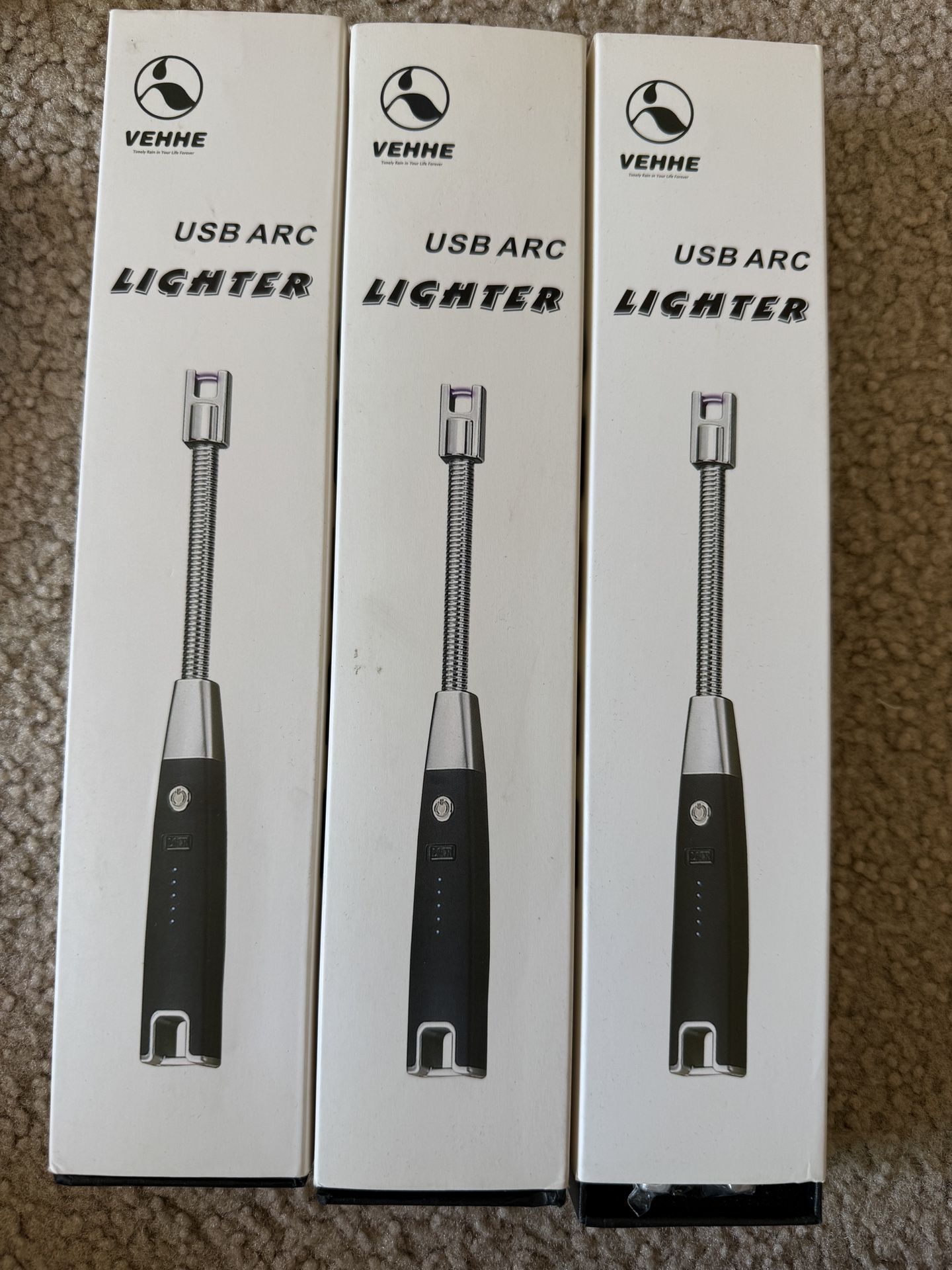 Cool set of 3 VEHHE USB arc lighters. These are electric, flameless lighters. Rechargeable with USB. Good for candles, camping, or whatever you need a reliable light for.