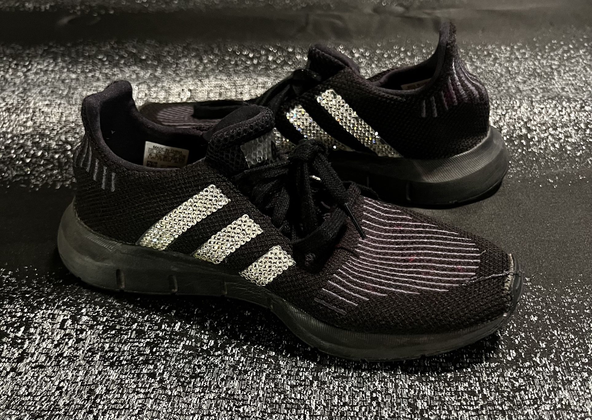 Womens sz6 crystals Adidas Swift Run shoes. Customized with crystals on outer logos Authentic adidas shoes customized with crystals. Great condition. No holes tears or stains. Smoke free pet free home.