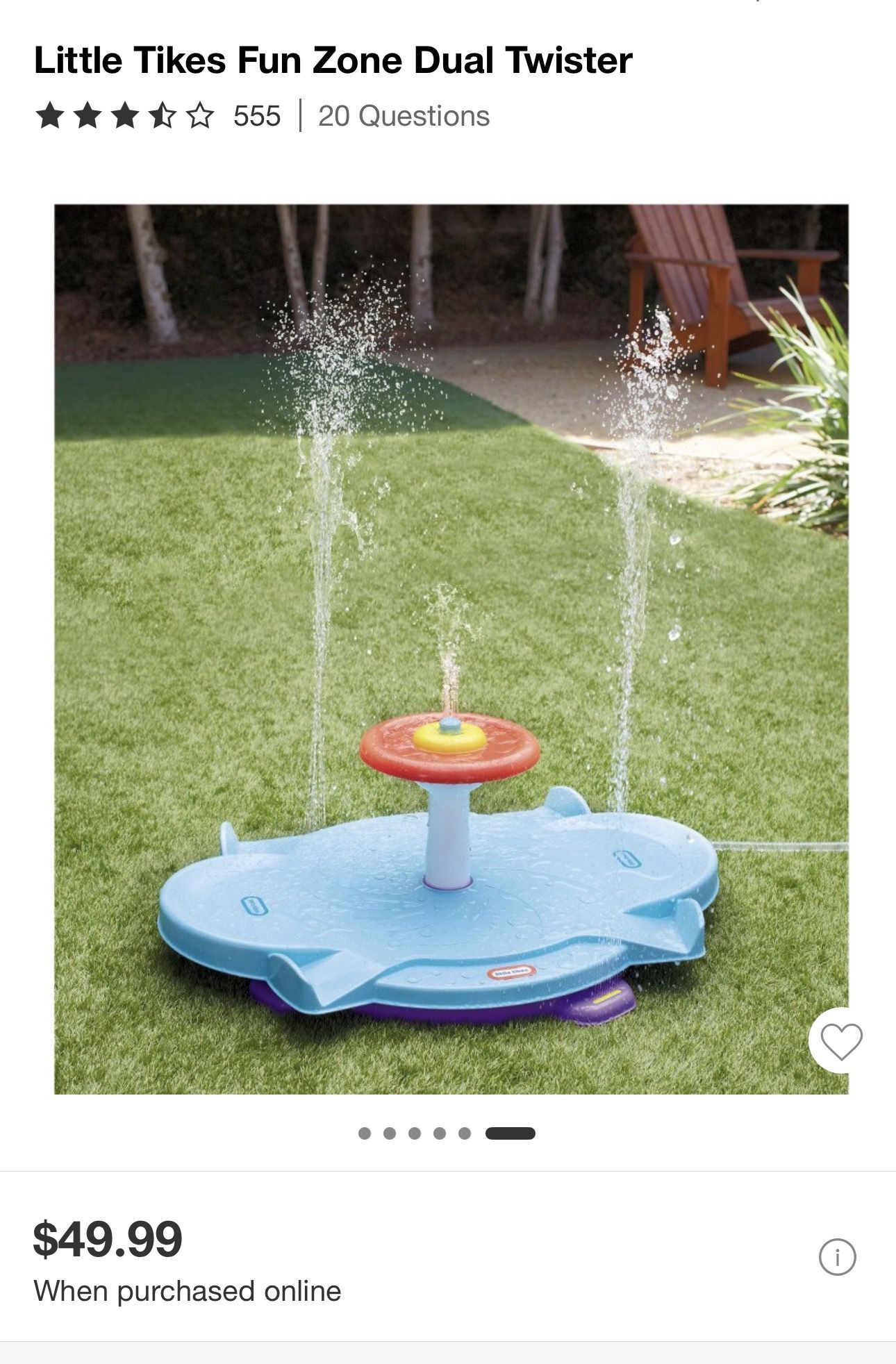 RETAIL $50 β’ New in Box Bring the thrill of the theme park home with Little Tikes Fun Zone toys! The Dual Twister gets kids spinning round and round, with a friend or on their own. Want more action? Take it outside, attach the garden hose and now you've got a wet 'n wild Dual Twister! For added fun, kids can change the water spray direction with a touch of the activation button in the center of the wheel. Perfect for indoor or outdoor fun. Create the ultimate theme park experience with the complete line of Fun Zone toys!