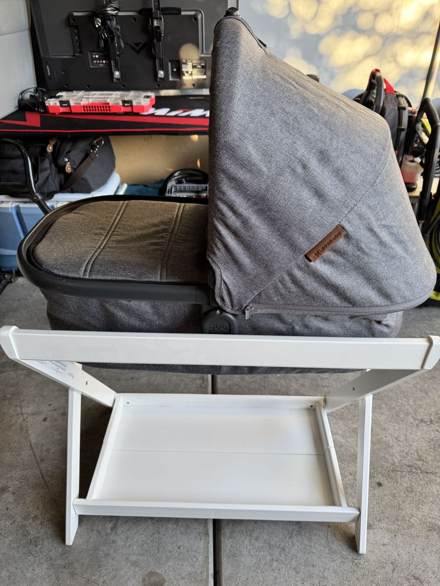 Uppababy V2 bassinest (can also be used on uppababy v2 single stroller & double) Retails for: $279.00 Uppababy bassinest stand Retails for: $199.00 Color: Greyson