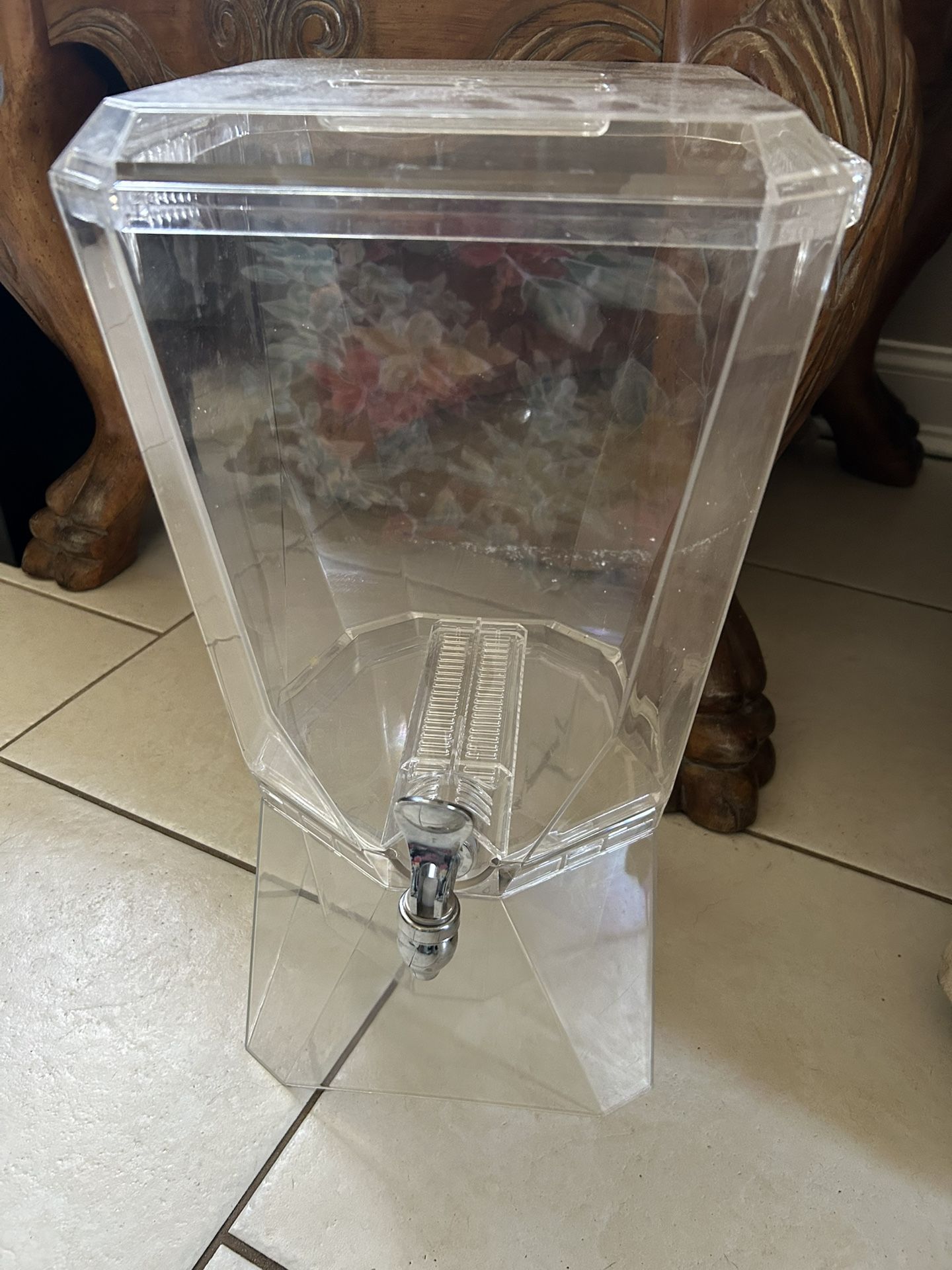 3.5 Gallon Beverage Dispenser. It is an extra-large, clear acrylic dispenser designed to hold up to 3.5 gallons of beverages. Key Features: Capacity It holds approximately 3.5 gallons (13.2 liters) of liquid. Material The dispenser is made from clear acrylic material. Design It features a hexagonal shape, a matching base for elevation, a lid (sometimes designed for adding garnishes), and a "no drip" spigot. Usage These are commonly used for serving punch, iced tea, lemonade, and other cold drinks at parties and events. Pickup Details: * Located in East Orlando near UCF (32817) * No holds, first come, first served * Sold "As Is" with no exchanges, cancellations, or refunds Please note that the post will be removed once the item is sold. Check out my profile for other listed items!