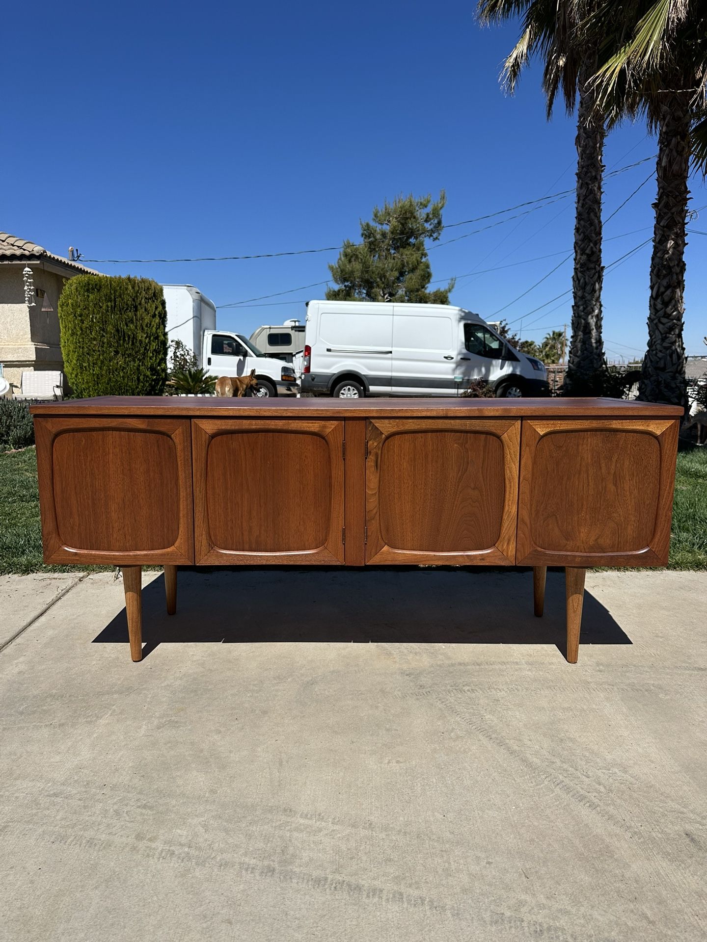 IG: only_modern Vintage mid-century modern credenza with a warm walnut wood finish and sculpted panel doors. Features four cabinet doors that open to a spacious interior, no shelves. Dimensions: 58 in L, 18 in W, 25.5 in H. Pick-up location Hesperia, CA or Rosebowl flea market. Delivery available to the SoCal area.