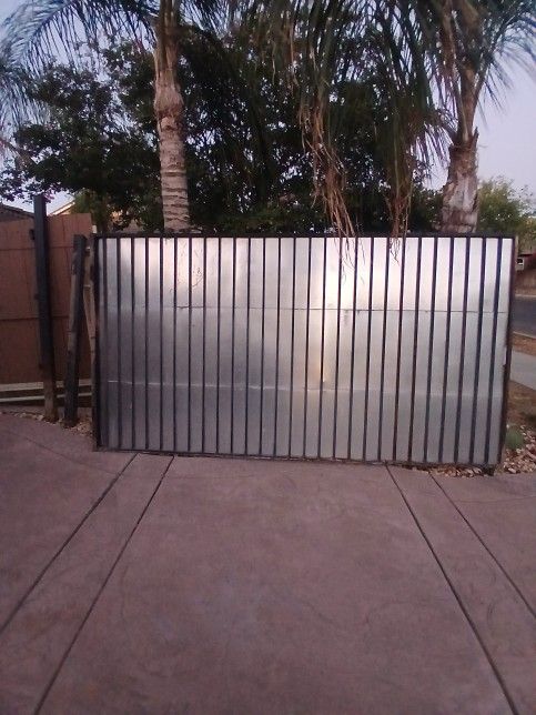 Heavy material, great condition Door is 10' length x 5' 5/8" width 2 posts 4x4: 1 is 7' 4" height and the other is 6' 2" height