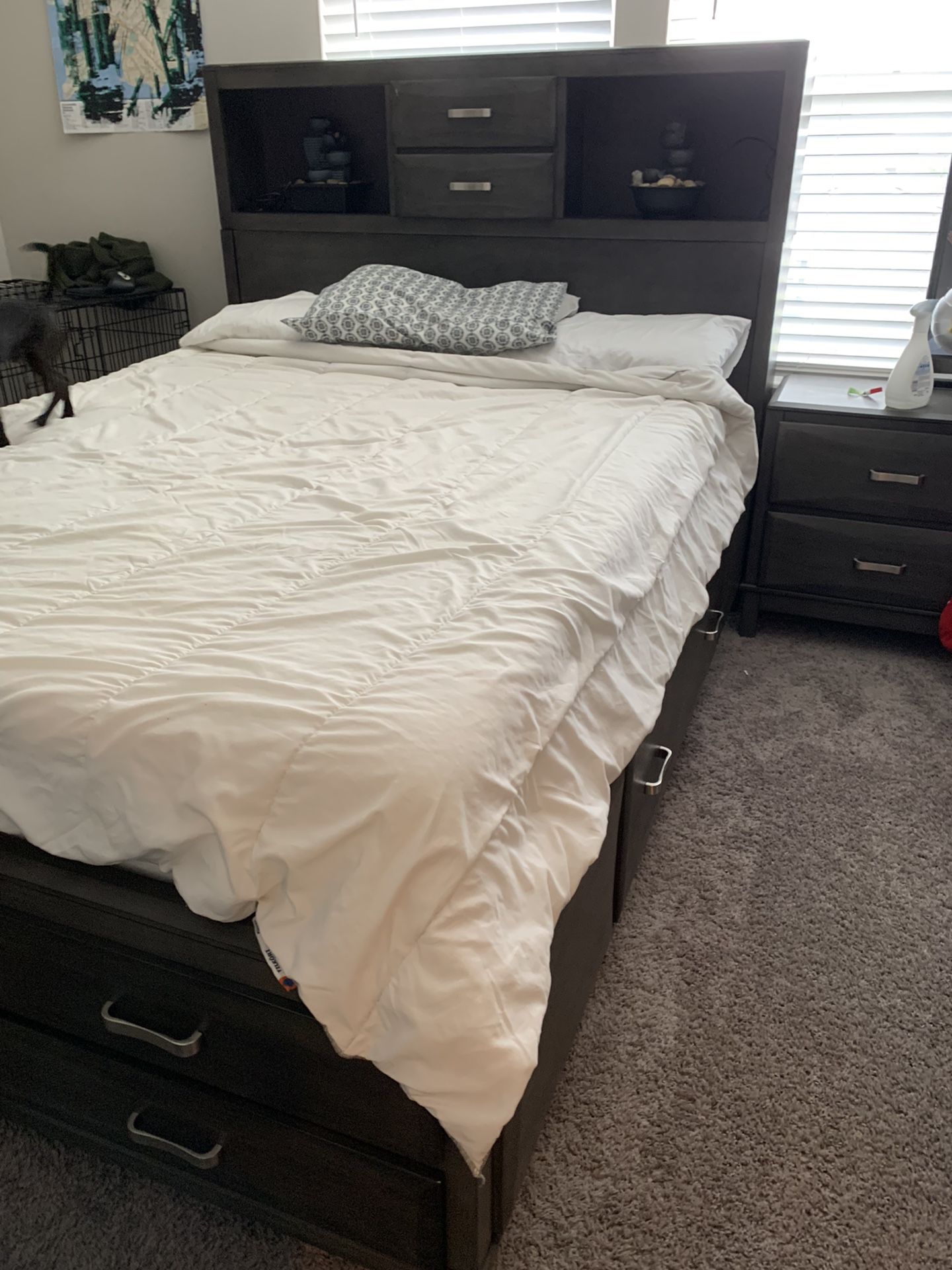 Has a few scratches comes with two large drawers on the bottom of the bed, 4 drawers in the front of the bed, 2 small ones on the headstand and comes with a nightstand and the mattress. In good condition barely used it and has been in storage.