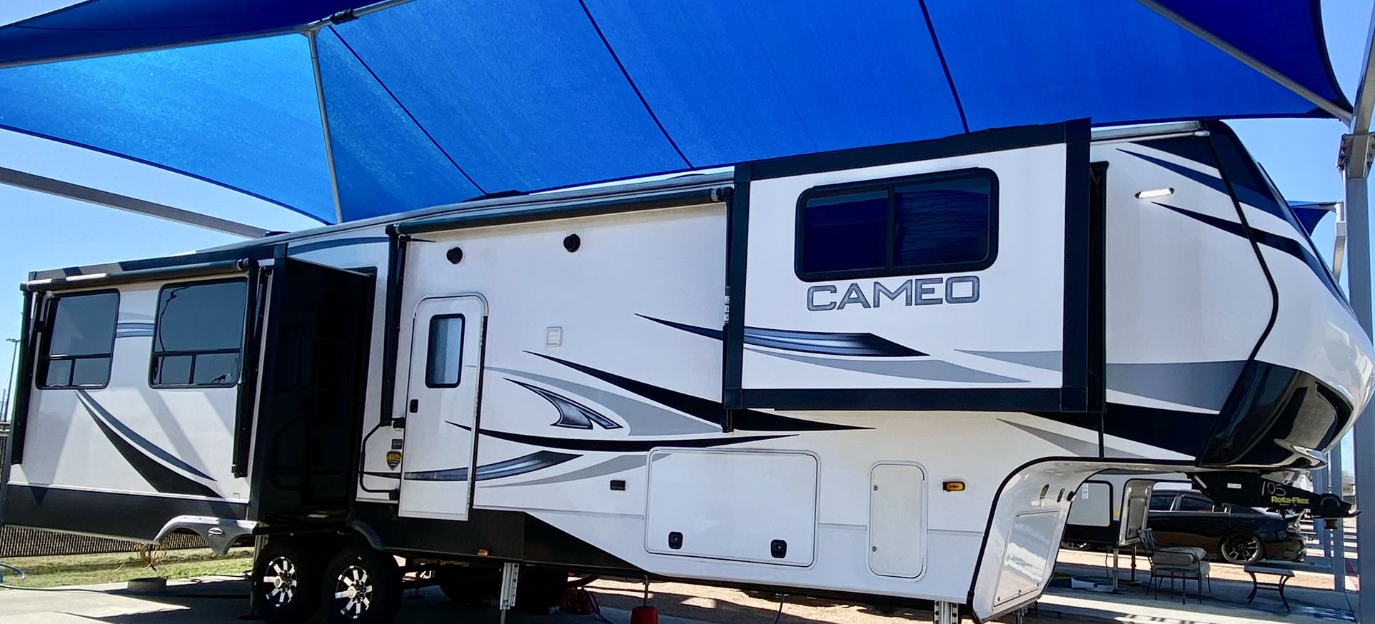 2021 Cameo 40 ft 4 slides 2 ACs Double awnings Model number 3701 RL King walk around bedroom Fireplace in bedroom Bedroom sofa with underneath storage Private bathroom with stand-up shower Island kitchen Corian countertops Entertainment center with flat screen TV and fireplace Sofa hide a bed Two heated recliners with massage and lights Residential refrigerator freezer Full size, Washer and dryer Wine refrigerator cooler Four way auto leveling system All season weather package Outdoor shower outdoor speakers Non-smoker, no pets photos were taken January 19, 2026