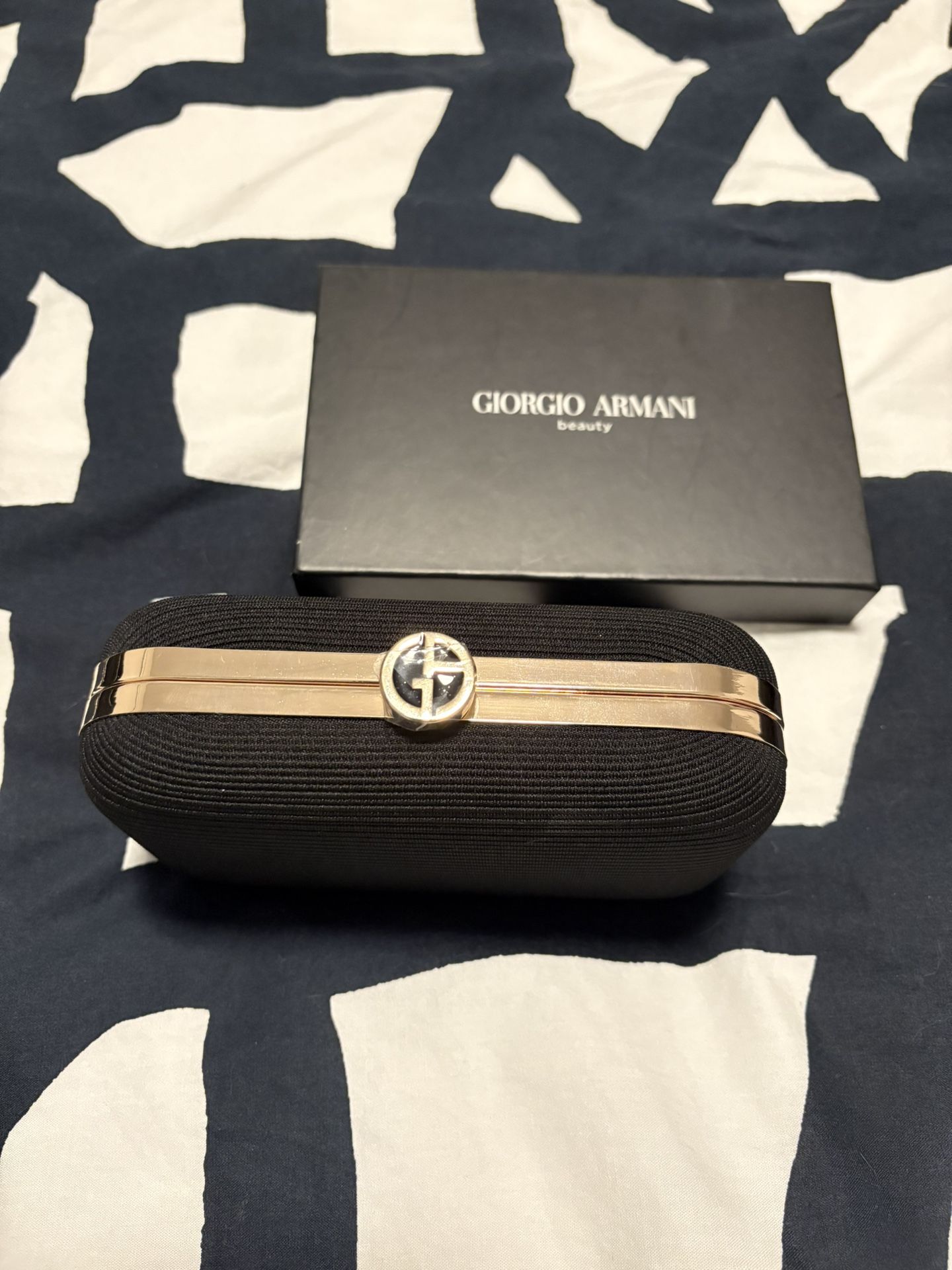 GIORGIO ARMANI (BEAUTY) black fabric and light rose goldtone metal clutch. Approx 6" x 4" x 2" and weights 233 grams