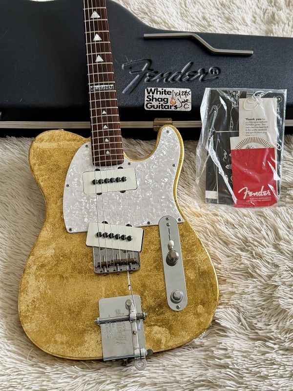 The name says it all! This is just 1 of 250 Japanese made Jazz-A-Caster's - Will Ray of the Hellecasters limited edition model. It features a gold leaf Telecaster body, a rosewood fretboard w/ pyramid shaped pearloid inlays, a Strat headstock, Schaller locking tuners, a set of special designed Seymour Duncan Jazzmaster pickups and the insane Hipshot Will Ray B-Bender, factory installed. The gold leaf finish is all there and there are just a few small marks. This is a super rare guitar that'll surely turn heads, give double takes, strike fear into the listener. And leave watchers shakin' their damn heads. This is not only highly collectable it is also a real showman/woman’s piece. It weighs about 8.6lbs on my scale, which is quite light given the hardware. This includes the original hardshell Fender case, candy and B-Bender hip trem bar. The 1997 Fender Hellecasters Limited Edition Will Ray Jazz-a-Caster is a unique, Telecaster-style guitar with a gold foil finish, a satin-finished maple neck, custom-made Seymour Duncan Jazzmaster pickups, and a Hipshot B-Bender system. Key Specifications Feature Specification Source Body Basswood, T-style shape Finish Gold Foil Leaf (real gold leaf) Neck Bolt-on, satin-finished maple, "Soft V" profile Headstock Small-style Stratocaster shape Fingerboard Rosewood with white pearloid triangle inlays Frets 22 frets Scale Length 25.5" Pickups Two custom-made Seymour Duncan reverse-wound Jazzmaster soapbar P90s Controls Volume, stacked tone controls (one for each pickup), 4-way selector switch Hardware Chrome Tuners Schaller locking tuners Bridge/Tailpiece 3-saddle Telecaster bridge with a Hipshot B-Bender system Origin Made in Japan (Limited Edition run) Unique Features Hipshot B-Bender: This mechanical device, operated by engaging a rod with the player's hip, allows for instant B-string bends, a signature feature of Will Ray's playing style. Custom Electronics: The special 4-way switch offers versatile pickup combinations, including series and parallel options, while the concentric tone pots allow for individual tone shaping of each pickup. Aesthetics: The guitar features a unique Telecaster body shape combined with a Stratocaster headstock and a "Hellecasters" logo inlay at the 12th fret. Condition wise, this guitar is in excellent shape. It has a few small marks here and there from light play. There is some light, hard to picture checking on the gold flake finish. There is one blemish as pictured on the side. Includes everything pictured This IS available if this listing is still online. I am in the Culver City area. Trades are always considered if you are in the Los Angeles area. Just let me know what you are offering in detail with photos if your trade item is not listed.