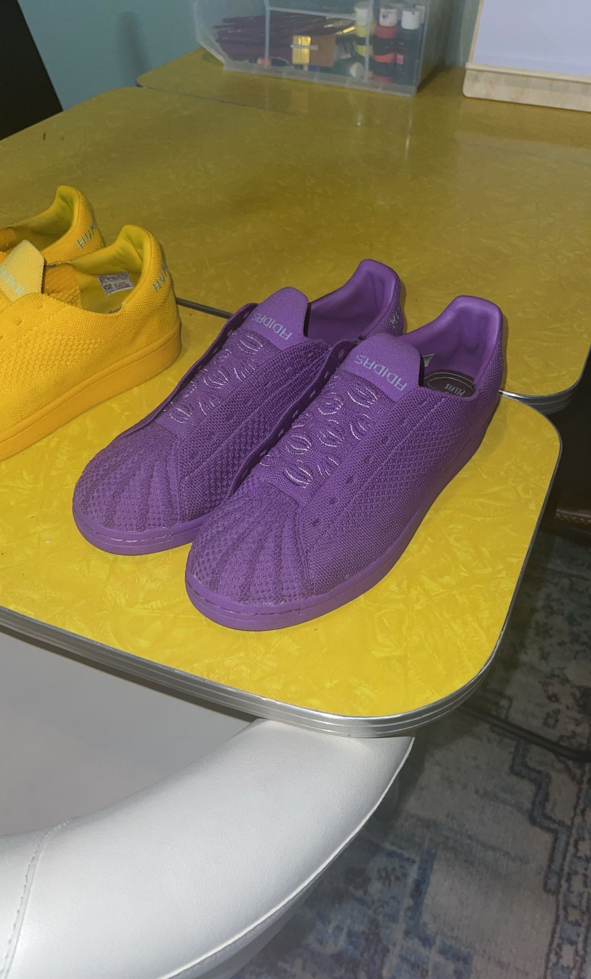 Purple adidas shell top acupuncture human race size 9 Purple ones are new yellow ones are somewhat used but still like new size 8.5 10$ for purple 10$ for yellow